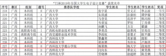 近日,2019年全国大学生电子设计竞赛广西赛区成绩揭晓。我院学子在比赛中再创佳绩,共斩获全国一等奖1项,区二等奖5项,区三等奖3项。同时我院是与广西大学、广西师范大学共同斩获全国一等奖的3所广西高校之一。