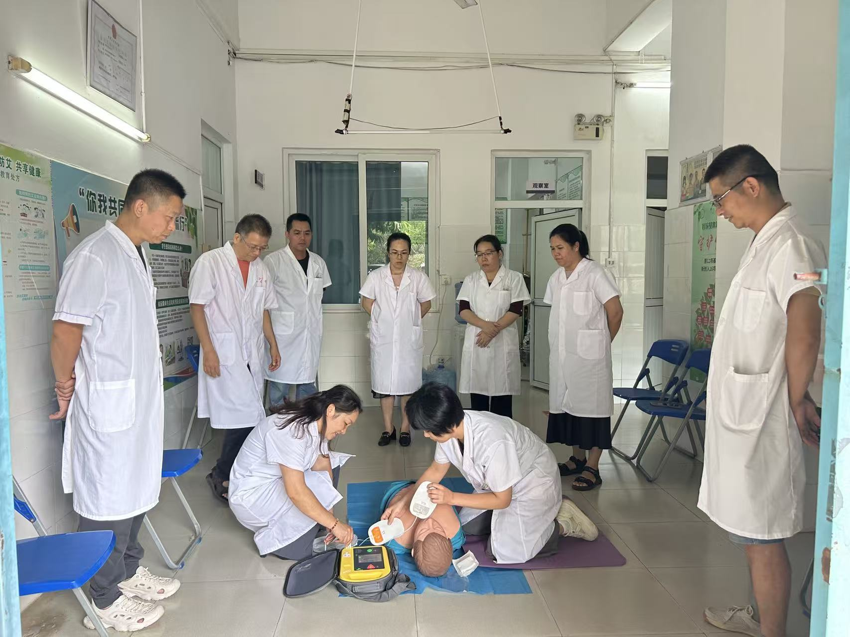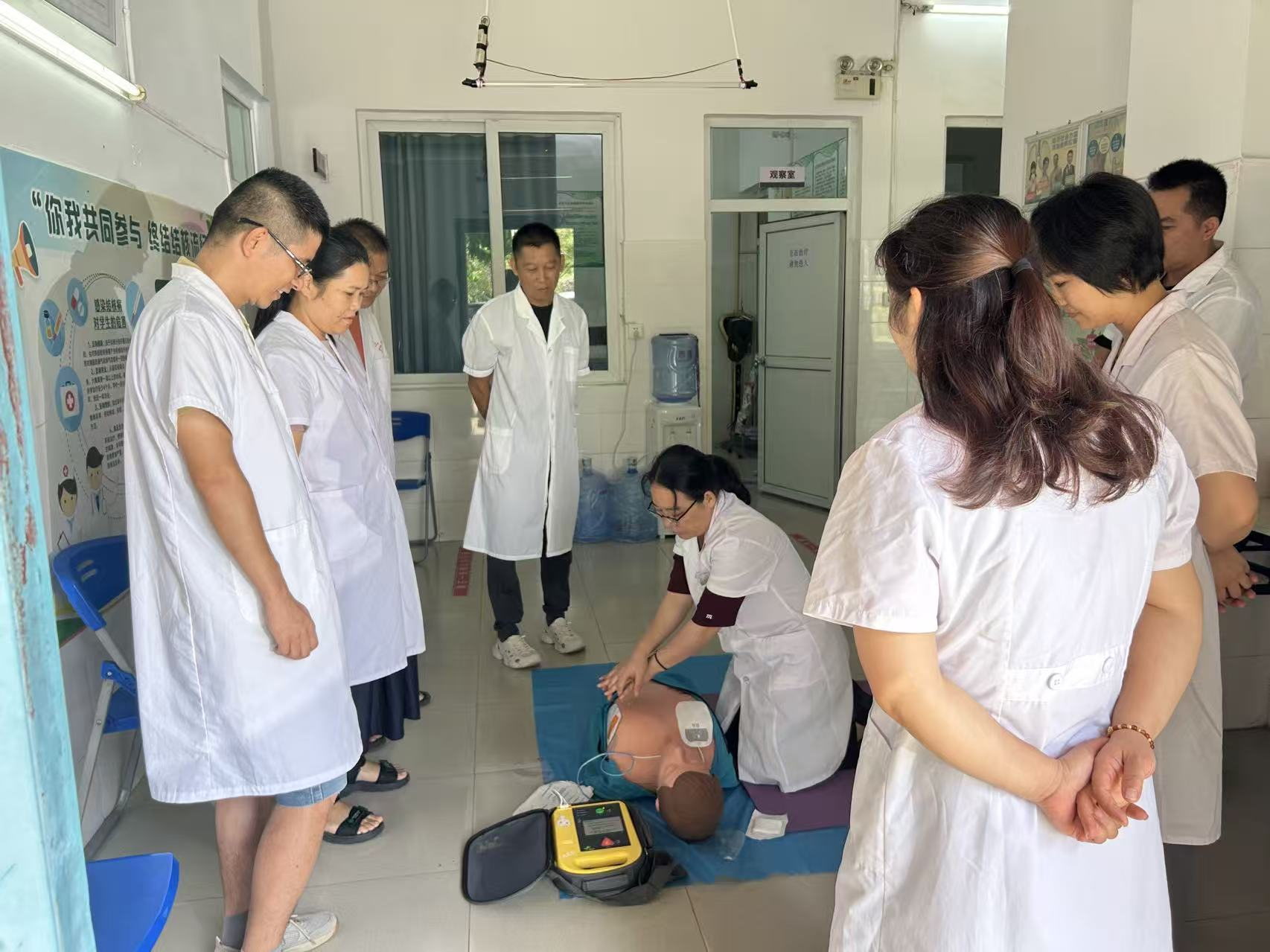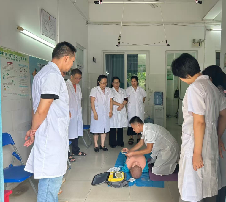 2025年8月25日上午,我校卫生所在门诊大厅成功举办了一场以“心肺复苏及自动体外除颤仪(AED)使用”为主题的急救技能实操培训,全体医务人员积极参与,现场学习氛围浓厚。