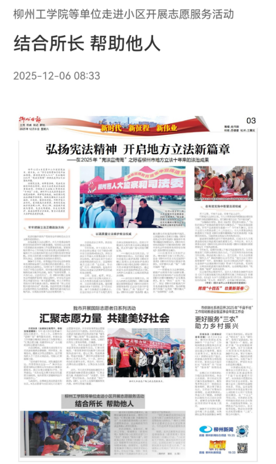 《柳州日报》:柳州工学院等单位走进小区开展志愿服务活动结合所长帮助他人