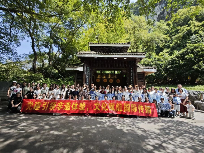 在龙潭公园侗寨,“扎染非遗韵染共传·英语赋能文化出圈”体验活动精彩上演。教工党员引导学生从扎染历史、染料来源、技法工艺等多角度展开调研,指导他们挖掘非遗技艺中蕴含的生态智慧与匠心精神,协助收集和整理英文讲解素材,确保讲解内容既专业准确又生动新颖,有效推动非遗文化的跨语言传播。