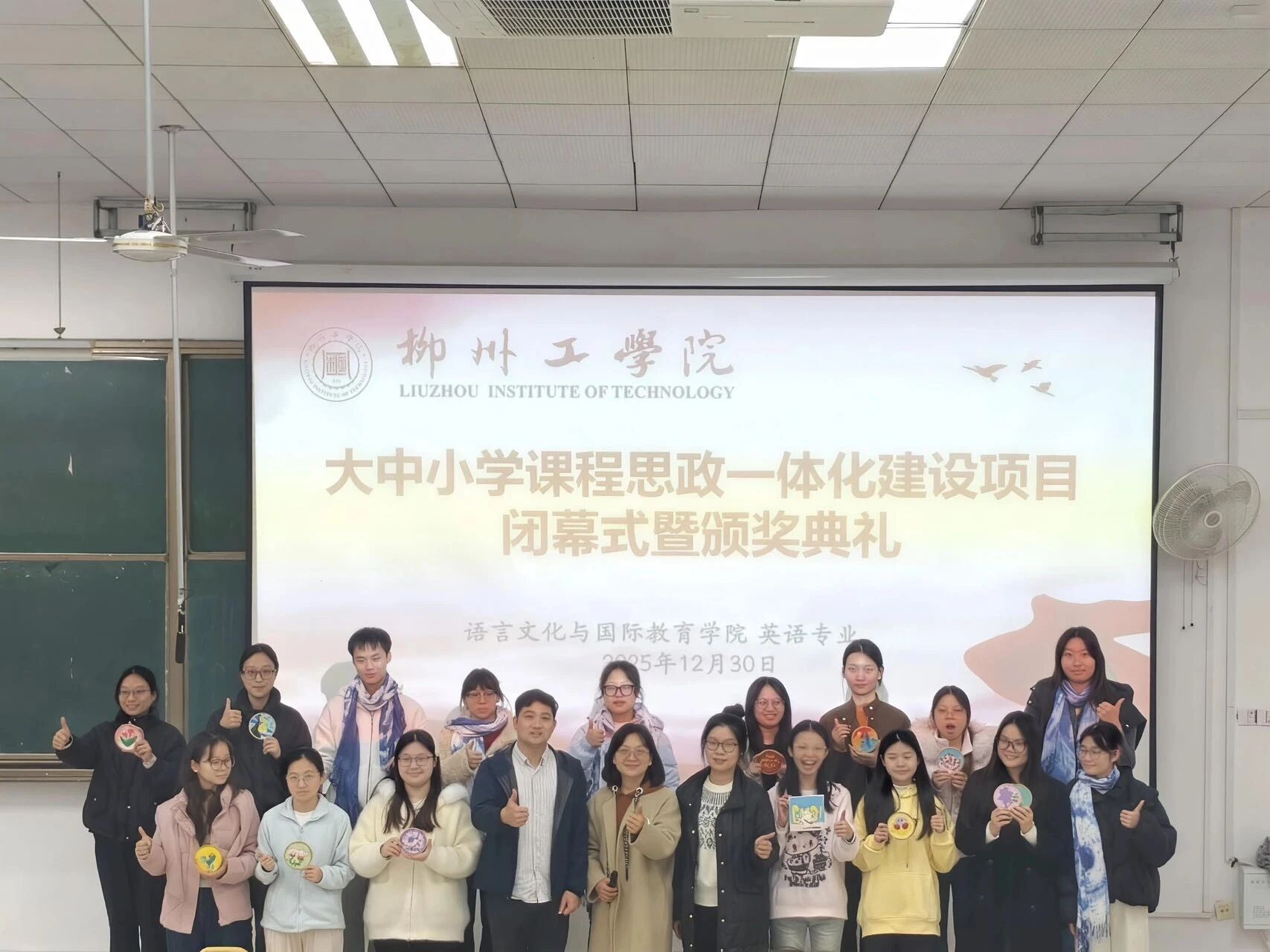 近日,语言文化与国际教育学院英语专业“大中小学课程思政一体化建设项目”顺利举行闭幕仪式暨总结座谈会。语言文化与国际教育学院副院长董月琳、英语教研室教师、2023级英语专业学生及柳州铁一中学校企合作校外导师共同出席本次活动。仪式上,全体与会人员观看了项目总结视频,嘉宾为获奖学生颁发证书,学院领导为校外指导教师授予聘书。在随后的座谈会上,各方代表围绕项目成效与未来发展进行了深入交流。