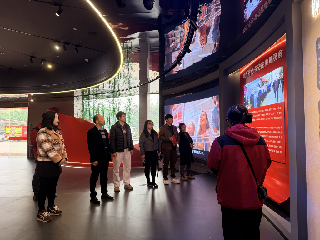 文海燕一行在周文玲副总经理的陪同下,先后参观螺霸王螺蛳粉文化展览馆与自动化生产车间。在1200余平方米的展览馆内,通过实物陈列与智能互动,系统了解螺蛳粉从街头小吃到百亿产业的蜕变,感受企业深耕非遗文化的匠心;沿200米透明参观通道,实地观摩自动化生产线与包装流程,详细调研产品工艺、品质管控及产业数字化现状,为后续合作积累鲜活实践素材。