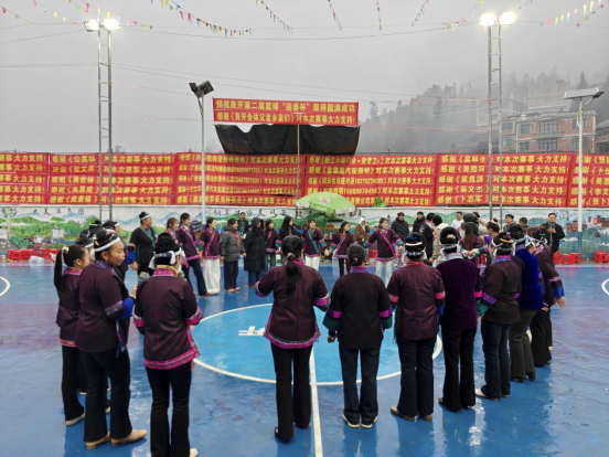 因绘制点位于良开屯篮球场,画面以球场为中心,左侧绘戏台、右侧绘鼓楼,外围点缀居民房、水井、凉亭等景致;球场上,裁判员吹哨抛球、球员起跳抢球的瞬间被生动定格,场外观众喝彩助威的场景跃然墙上;戏台前村民“多耶”欢舞,鼓楼前“百家宴”温情开席;结合滚良屯芦笙文化特色,戏台前还绘有村民吹芦笙的热闹画面。