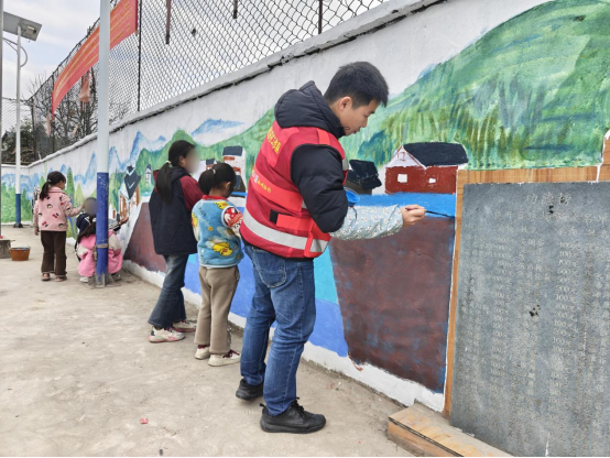 此前,郑利斌曾在滚良小学支教一学期美术课,看到他在绘制壁画,孩子们主动参与其中。在他的指导下,孩子们勾勒线条、填充色彩,将对家乡的热爱融入每一笔触。这种“共建共享”模式,让壁画成为连接高校与乡村、大人与孩子的文化纽带。