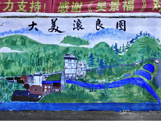 壁画创作由驻村工作队员郑利斌指导,驻村第一书记韦展艺、工作队员谭嘉朕携手村里学生共同完成。创作素材均取自滚良村实地风貌,以同乐村至净代村公路为主视觉,从左至右依次呈现滚良寨门、滚良屯、滚河屯、良开屯、梨木屯及净代村,鼓楼、戏台、小学、村部等地标建筑一一入画。