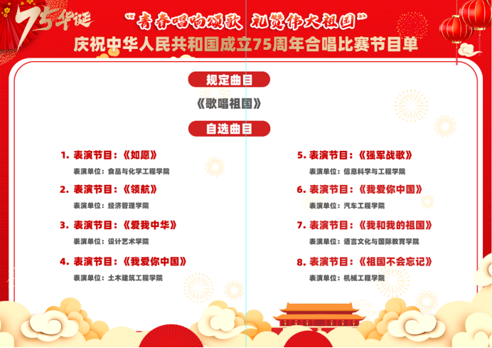 盛世华诞,举国同庆。9月29日晚,我校在大学生活动中心举行庆祝中华人民共和国成立75周年合唱比赛。本次合唱比赛以“青春唱响颂歌礼赞伟大祖国”为主题,校团委精心组织,各二级学院充分准备,共8支合唱队参赛,用歌声唱响时代主旋律,向祖国母亲献上最诚挚的祝福。