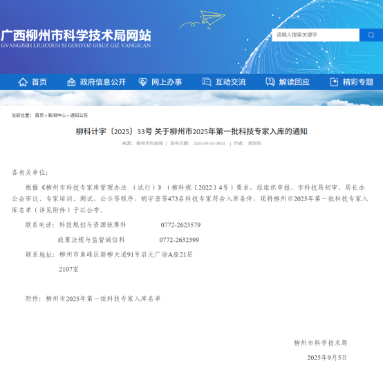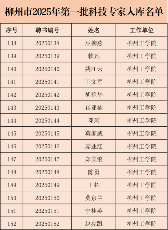 近日,柳州市科学技术局公布《柳州市2025年第一批科技专家入库名单》,我校15名教职工榜上有名。