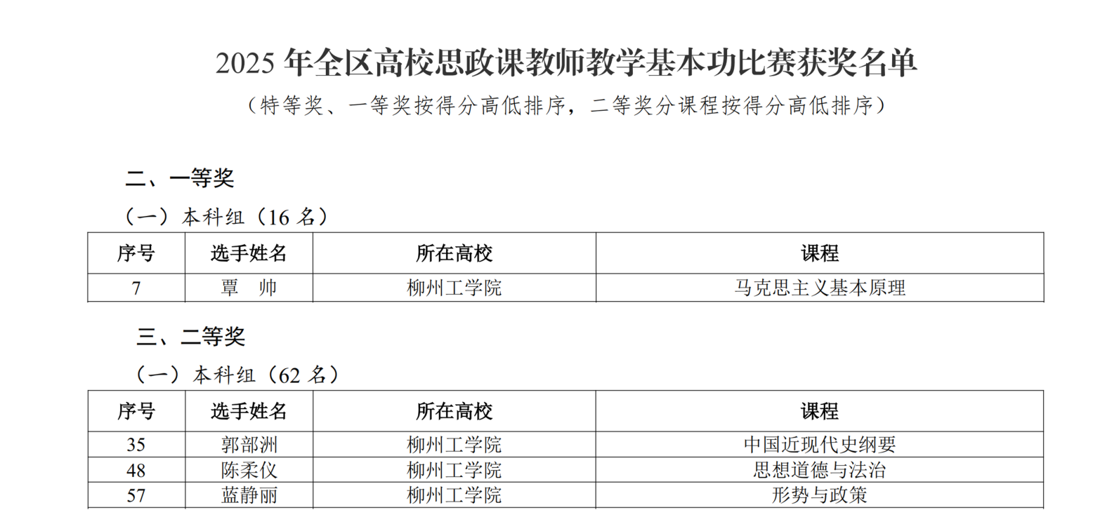 近日,自治区教育厅公布2025年全区高校思政课教师教学基本功比赛获奖名单,我校马克思主义学院四位参赛教师凭借扎实的教学功底、创新的教学设计与出色的综合表现,在激烈角逐中实现历史性突破,全员斩获佳绩:覃帅主讲的“马克思主义基本原理”课程荣获一等奖,郭部洲主讲的“中国近现代史纲要”、陈柔仪主讲的“思想道德与法治”、蓝静丽主讲的“形势与政策”课程均荣获二等奖,充分彰显了马克思主义学院思政课教学改革的丰硕成果与师资队伍的过硬实力。