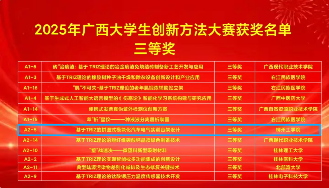 近日,2025年广西大学生创新方法大赛落下帷幕,汽车工程学院何川老师团队的《基于TRIZ的拼图式模块化汽车电气实训台架设计》项目凭借出色表现,在众多参赛作品中脱颖而出,荣获三等奖,为汽车工程学院赢得了荣誉。
