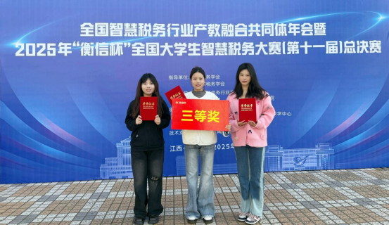 11月28日—30日,由全国智慧税务行业产教融合共同体、江西财经大学主办,浙江衡信教育科技有限公司提供技术支持的2025年“衡信杯”全国大学生智慧税务大赛总决赛成功举办。柳州工学院经济管理学院“柳江税帆”队(团队成员:贺思怀、翁玲玲、王敏;指导教师:李斯丝、钟声晓)在比赛中发挥出色,荣获全国三等奖。