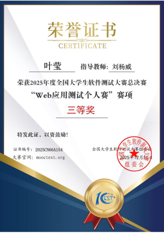 近日,第十届全国大学生软件测试大赛全国总决赛圆满落幕。本次大赛吸引了全国众多高校参与,竞争激烈。我校信息科学与工程学院共选派6名学生参赛,在省级选拔中表现突出。其中,叶莹同学成功晋级全国总决赛,并在Web应用测试个人赛中荣获全国三等奖。此外,我校学生还获得Web应用测试个人赛省赛二等奖1项、三等奖1项、优胜奖2项,实现了我校在该项赛事中的新突破。