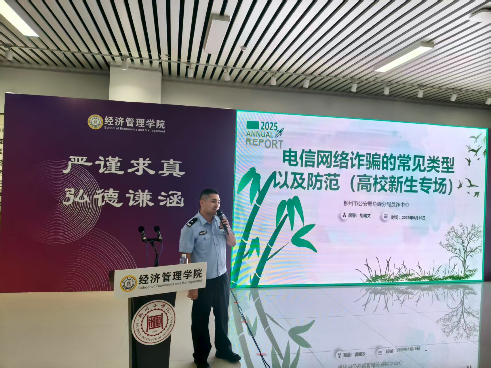 柳州市公安局鱼峰分局反诈中心胡曦文警官为新生带来“安全教育第一课”。他通过真实案例,详细讲解了防范电信网络诈骗的知识与技巧,提醒同学们提高警惕,保护好个人财产安全。