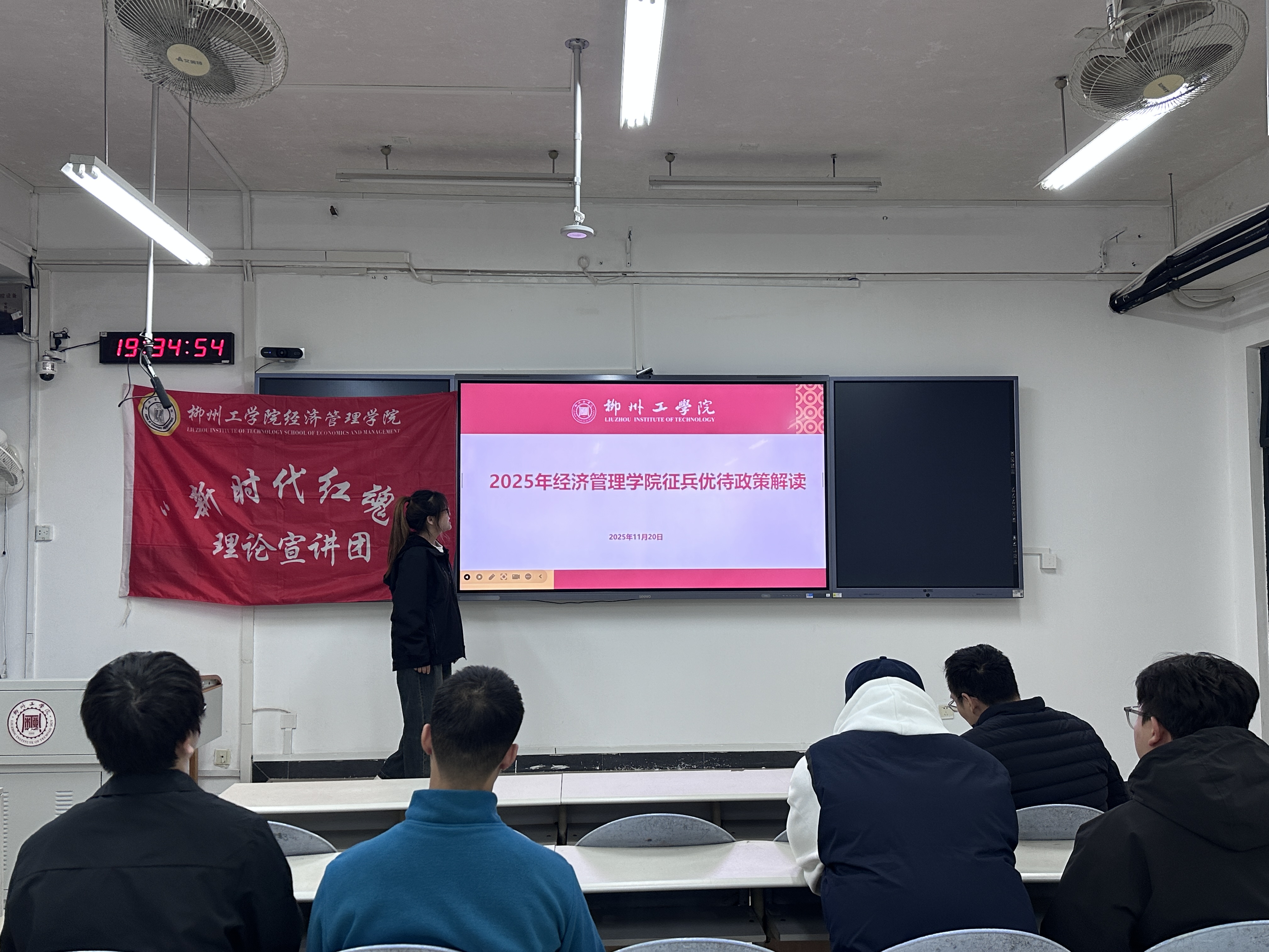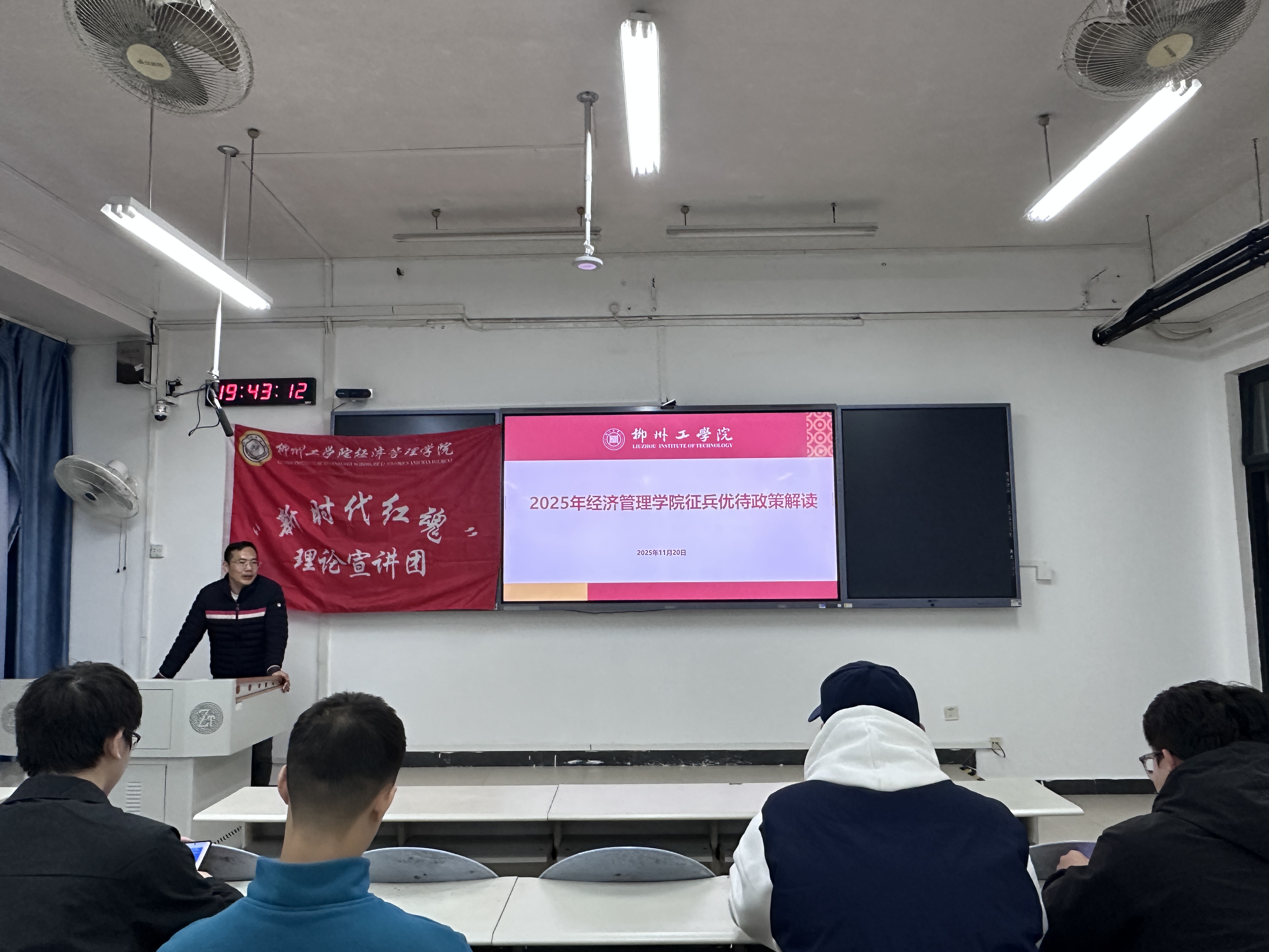 为深入贯彻新时代强军思想,积极响应国家征兵工作号召,经济管理学院于11月20日19:30在南校区第一教学楼302教室组织召开2026年应征入伍政策宣讲会。本次活动面向2022级有意向参军的学生开展,邀请红魂宣讲团成员参与政策讲解,由龚波涛老师主持。