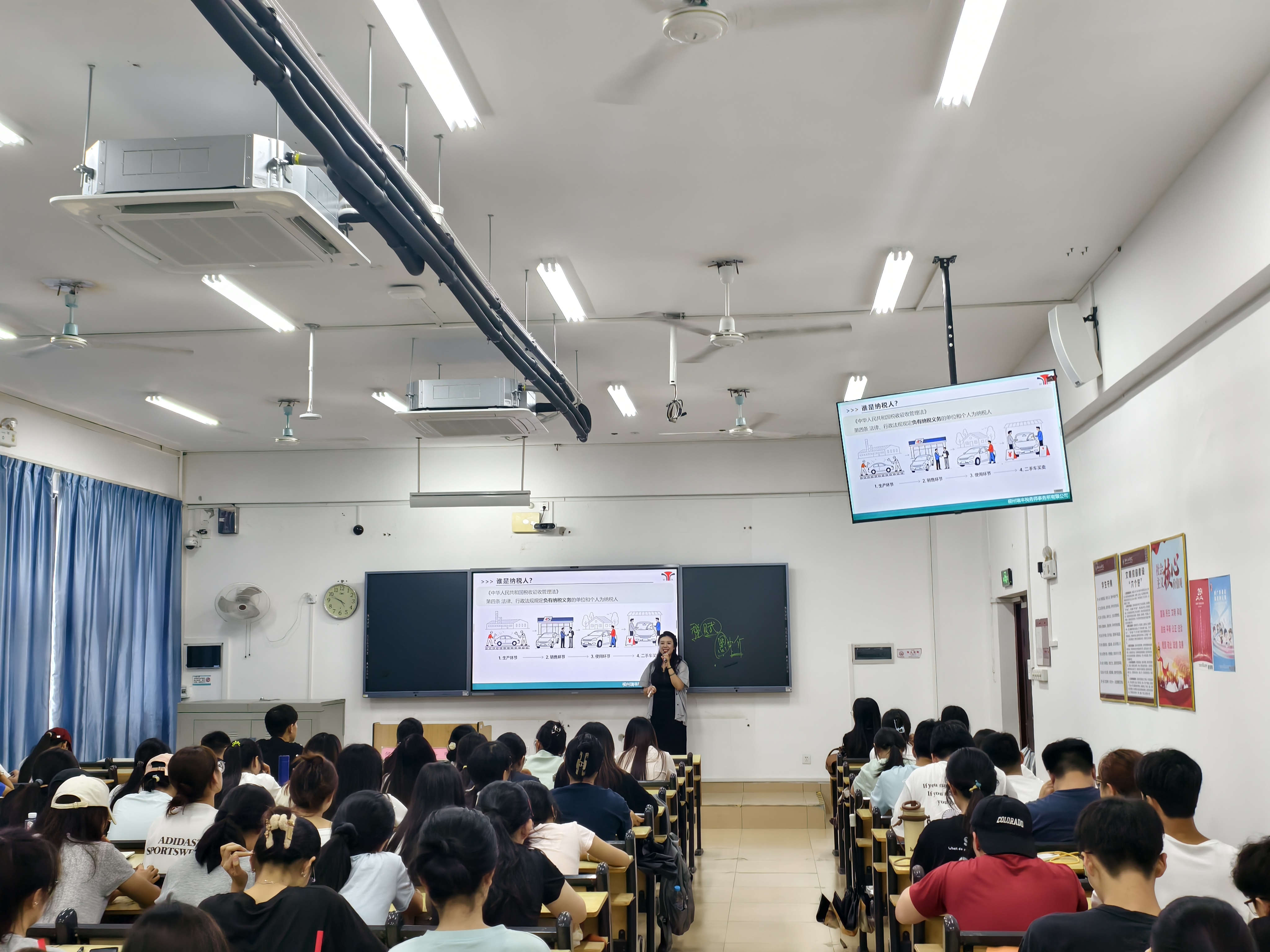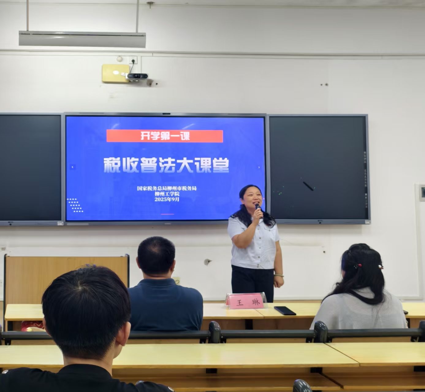 讲座伊始,李明院长对柳州市税务局领导及辛简慧所长的到来表示热烈欢迎,并邀请王琳主任致辞。王琳主任首先肯定了同学们积极的学习态度,随后阐述了学院与柳州市税务局共建税收普法教育实践站的双重意义。她表示,希望通过系列讲座推动税收法治观念扎根校园,并预祝本次活动取得圆满成功。