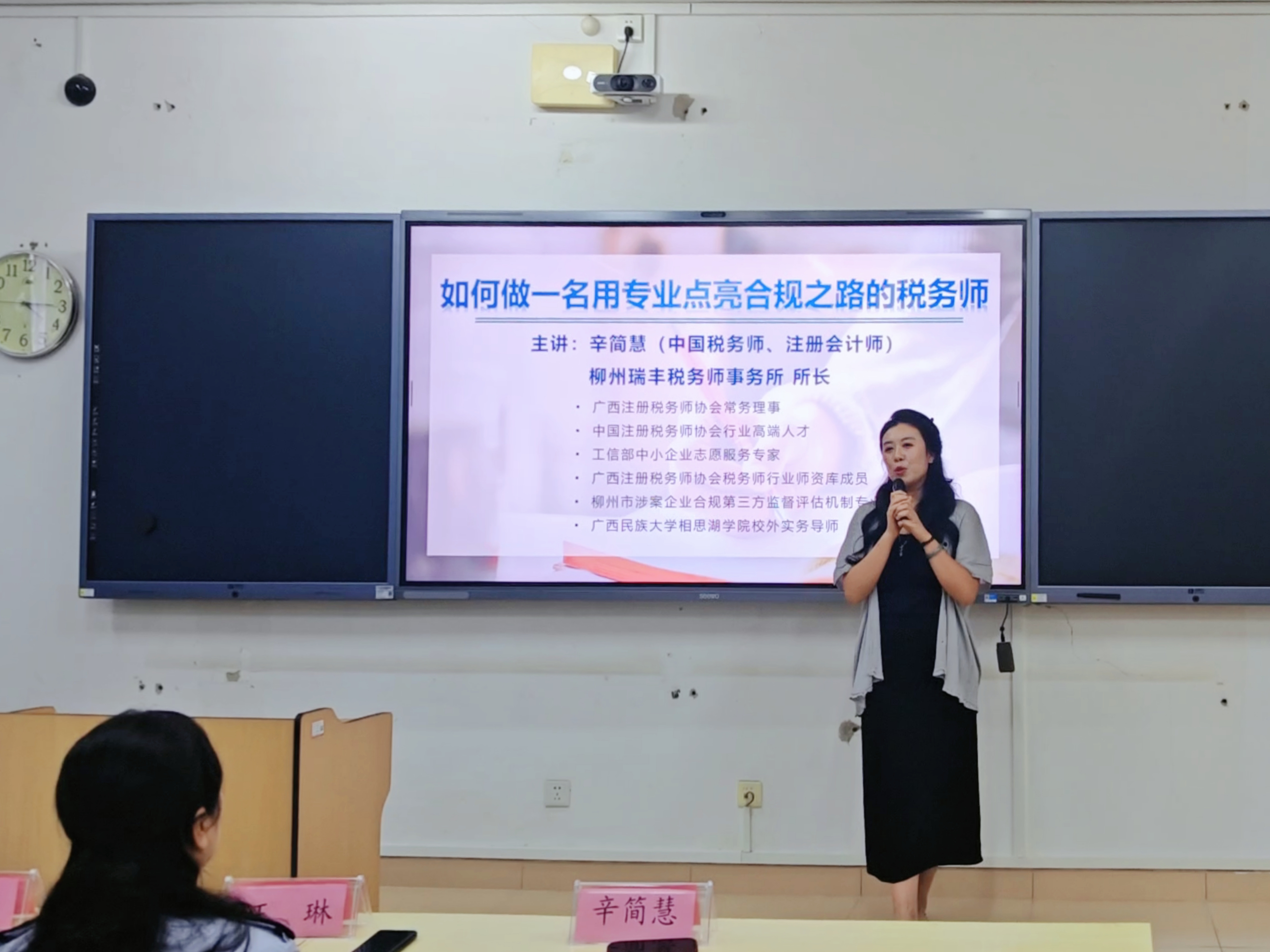 为深化税收普法教育,培养兼具专业素养与合规意识的税务人才,9月15日,柳州工学院经济管理学院财务管理专业与柳州市税务局联合开展的税收普法教育实践站第二期专题讲座在学院举行。本期讲座以《如何做一名用专业点亮合规之路的税务师》为主题,特邀柳州瑞丰税务师事务所所长、注册会计师、税务师辛简慧主讲,柳州市税务局纳税服务中心主任王琳、经济管理学院院长李明等嘉宾出席,90余名财务管理专业学生参与学习,共同探讨税务师职业发展与税务合规实践路径。