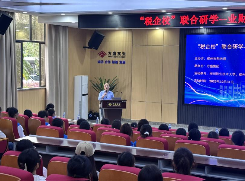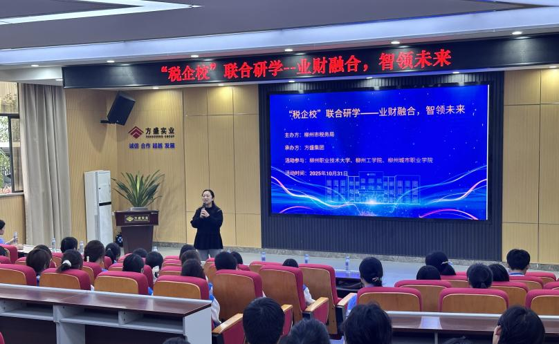 为深化产教融合,拓宽学生专业视野与行业认知,10月31日,柳州工学院财务管理专业25名学生在教研室主任李斯丝及韦良老师带领下,赴方盛实业集团参加由柳州市税务局主办的会计主题研学活动。本次活动由柳州市税务局主办、方盛实业集团承办,柳州职业技术大学、柳州工学院、柳州城市职业学院师生共同参与,旨在搭建校企沟通平台,助力学生提前了解企业会计实务与职业发展路径。