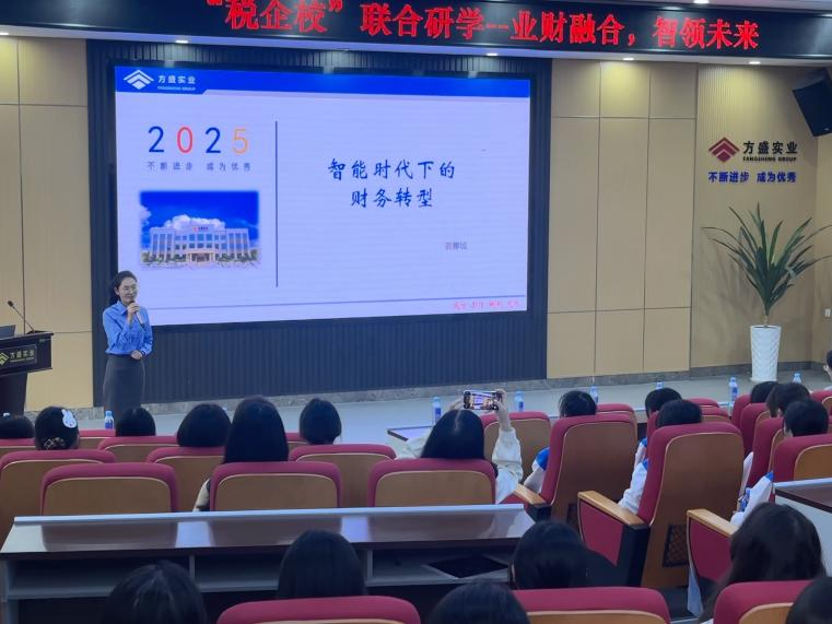 在座谈授课环节,方盛实业集团财务管理部主管会计师龚柳城作“智能时代下的财务转型”专题讲座。龚老师结合知名企业的先进实践,深入剖析了“业财融合”与“财税融合”的现代财务管理理念,其内容前沿、案例翔实,引发了在场师生的深入思考。紧接着,方盛实业集团集团财务管理部韦伶莉科长系统介绍集团组织架构、主要产品及市场客户,帮助学生建立对制造业企业运营的系统认知。