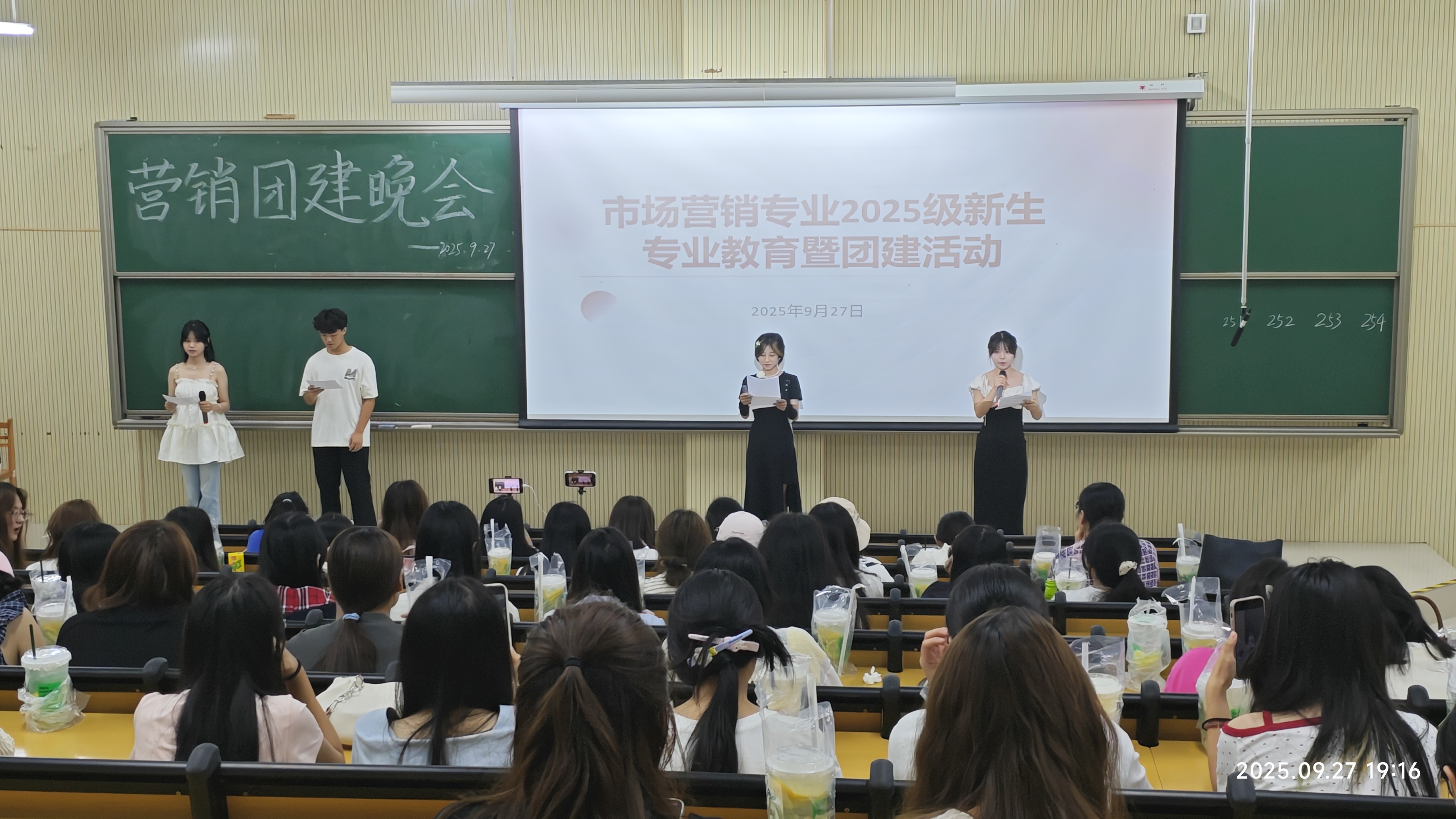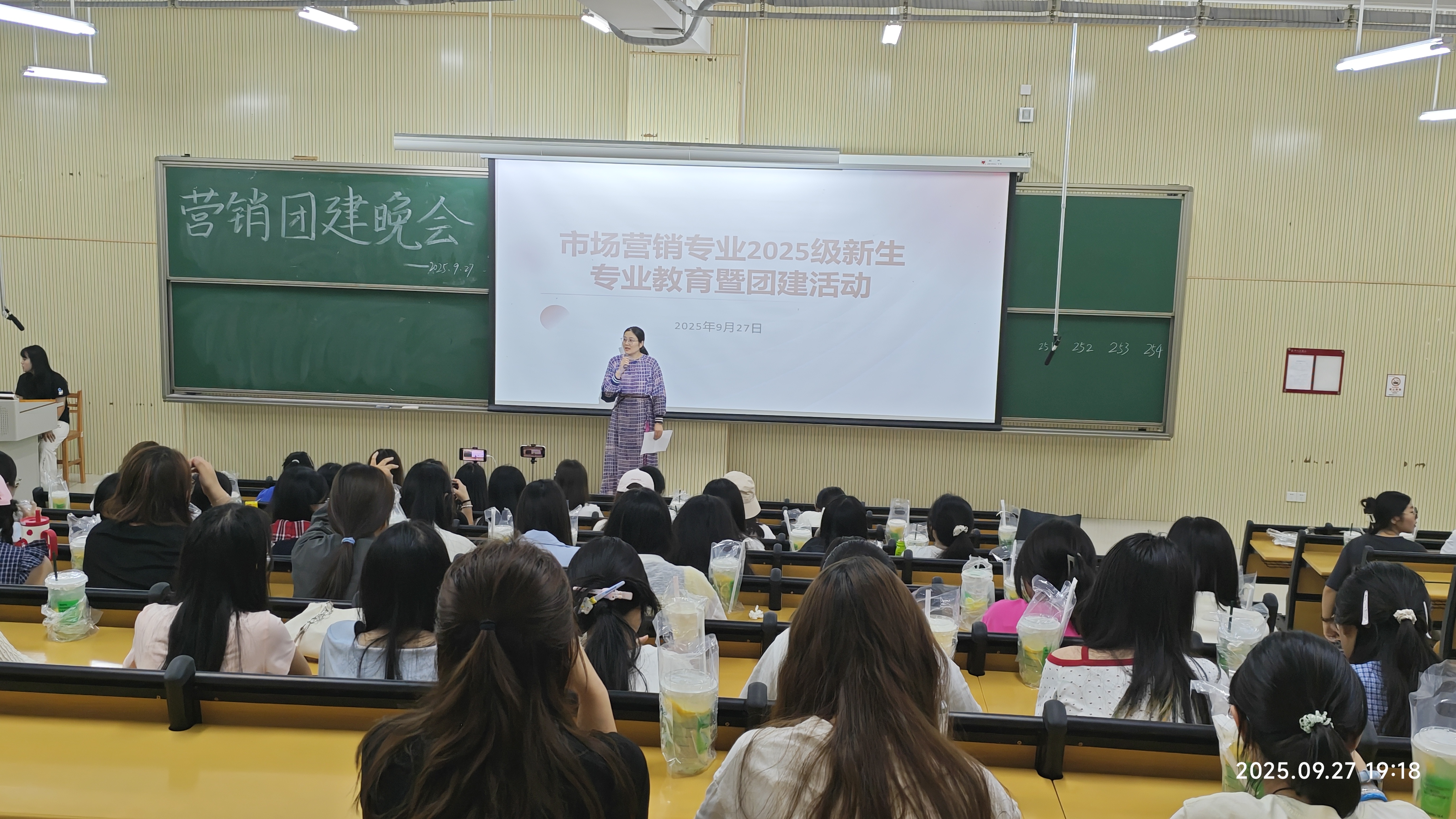 9月27日晚,经济管理学院市场营销专业2025级新生专业教育暨团建活动在T1-101阶梯教室举行。市场营销教研室主任王晖老师、辅导员黄志芳老师、各班班主任及班助与全体新生共同参与此次活动。