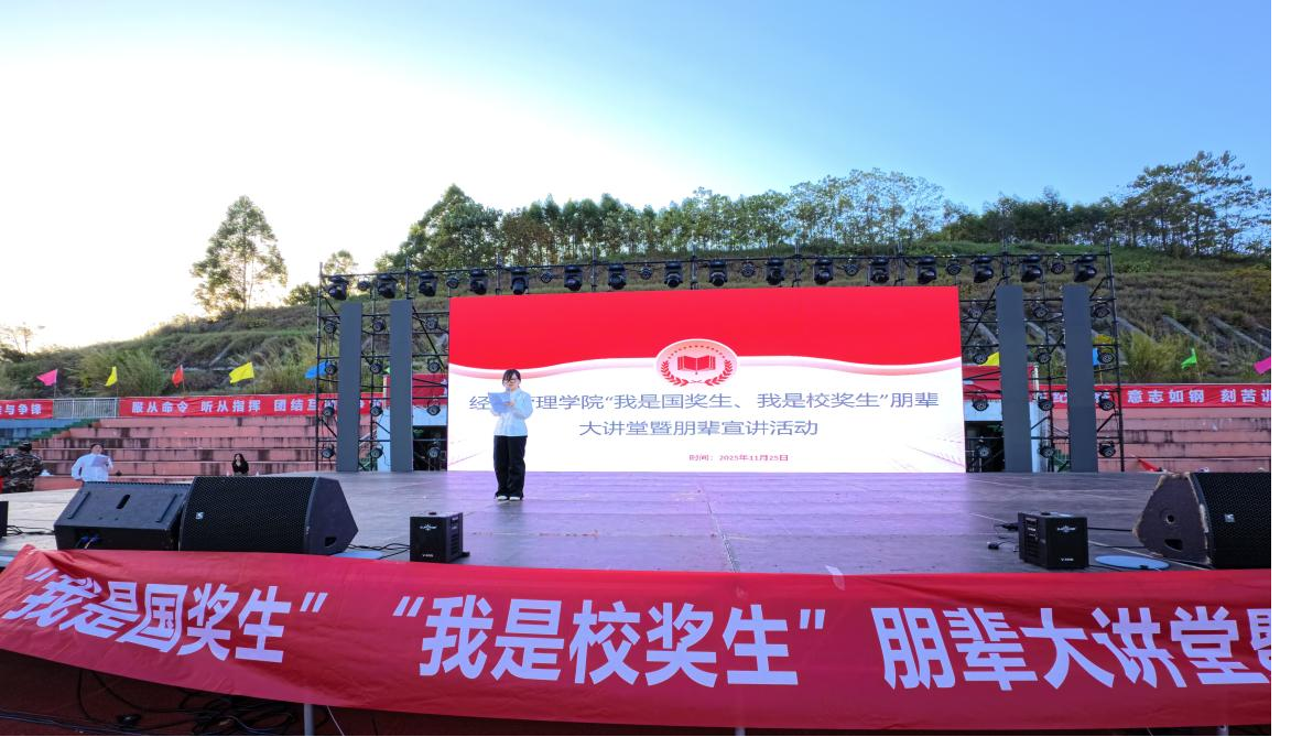 为充分发挥优秀学生的示范引领作用,引导2025级新生树立远大理想、明确学习目标,11月25日,经济管理学院在北校区军训训练场举办“我是国奖生·我是校奖生”朋辈大讲堂暨宣讲活动。活动创新采用“军训场面对面”形式,邀请优秀学生代表走进训练一线,让新生在磨砺意志的军训期间近距离感受榜样力量,激发成长内生动力。