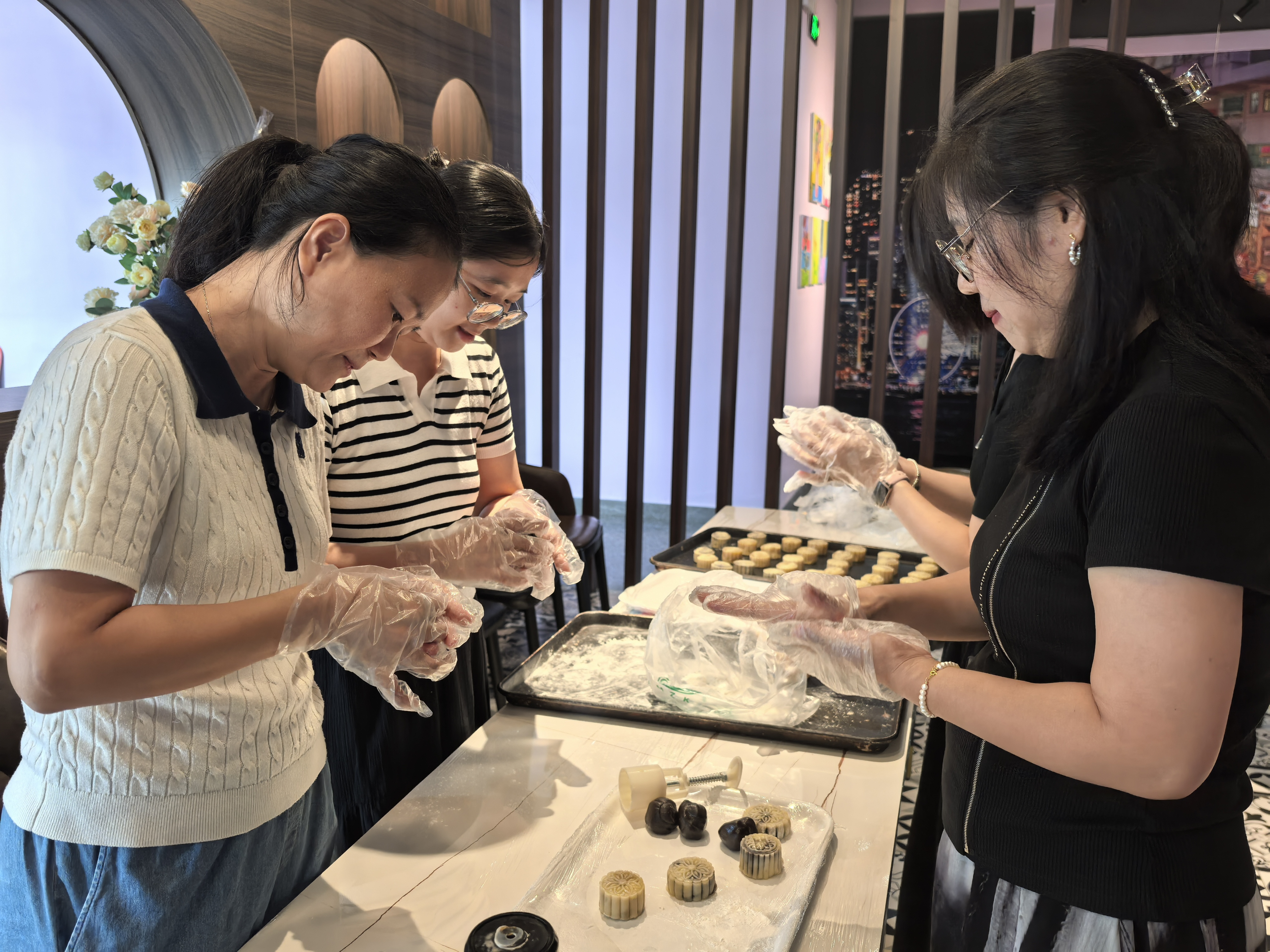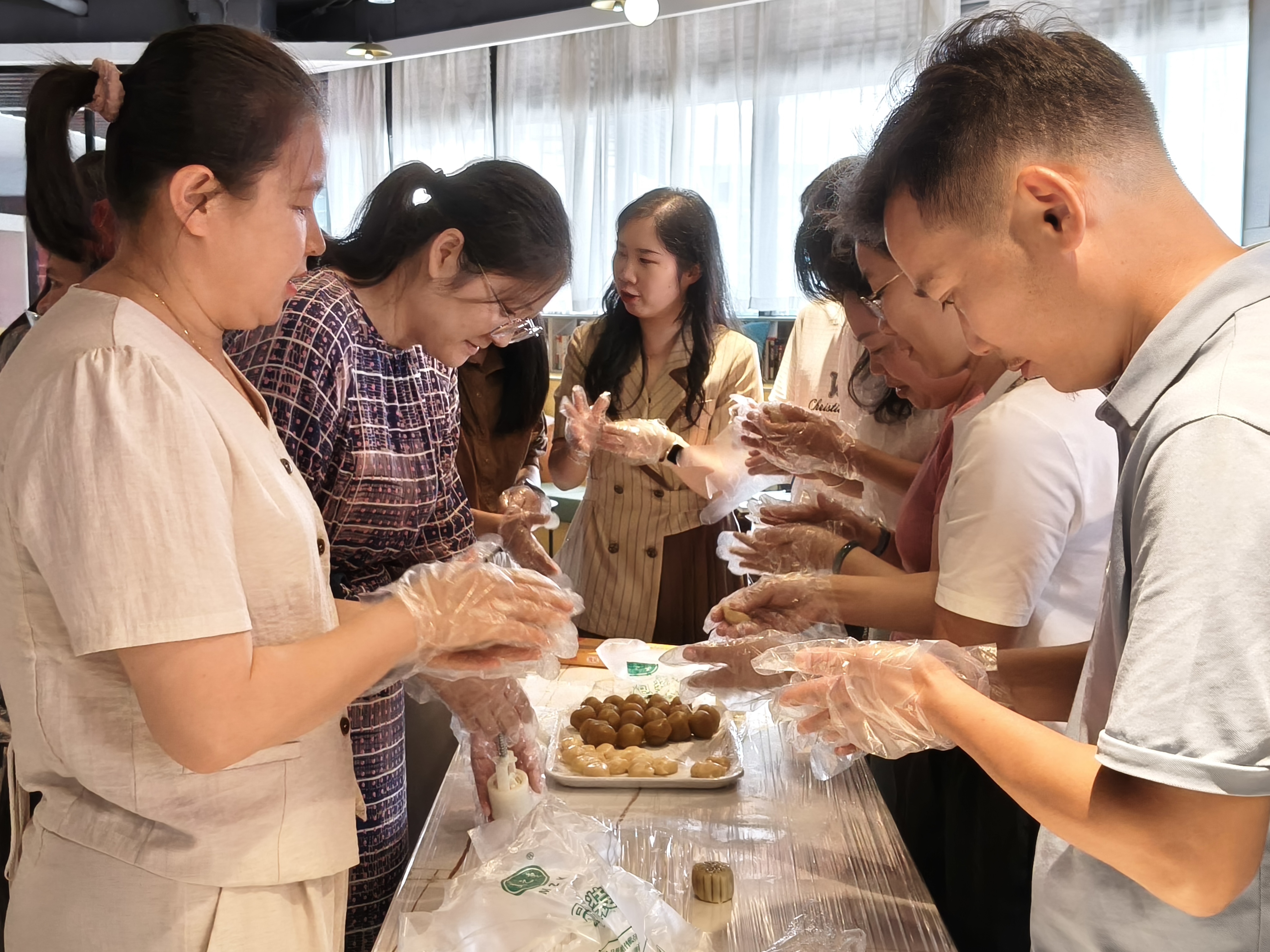 活动现场,专业面点师傅系统讲解广式月饼制作技艺,从分馅、包料到压模逐步示范。教职工们自由组队协作,根据个人喜好选用莲蓉、豆沙、五仁等传统馅料,压印出寓意团圆的花纹图案。活动期间,师生在温馨的氛围中畅谈学院建设,既交流工作经验,也分享生活感悟。现场制作的月饼成品不仅承载传统文化内涵,更成为凝聚共识的生动载体。