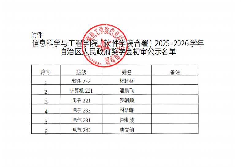 信息科学与工程学院(软件学院合署)2025-2026学年自治区人民政府奖学金初审公示名单