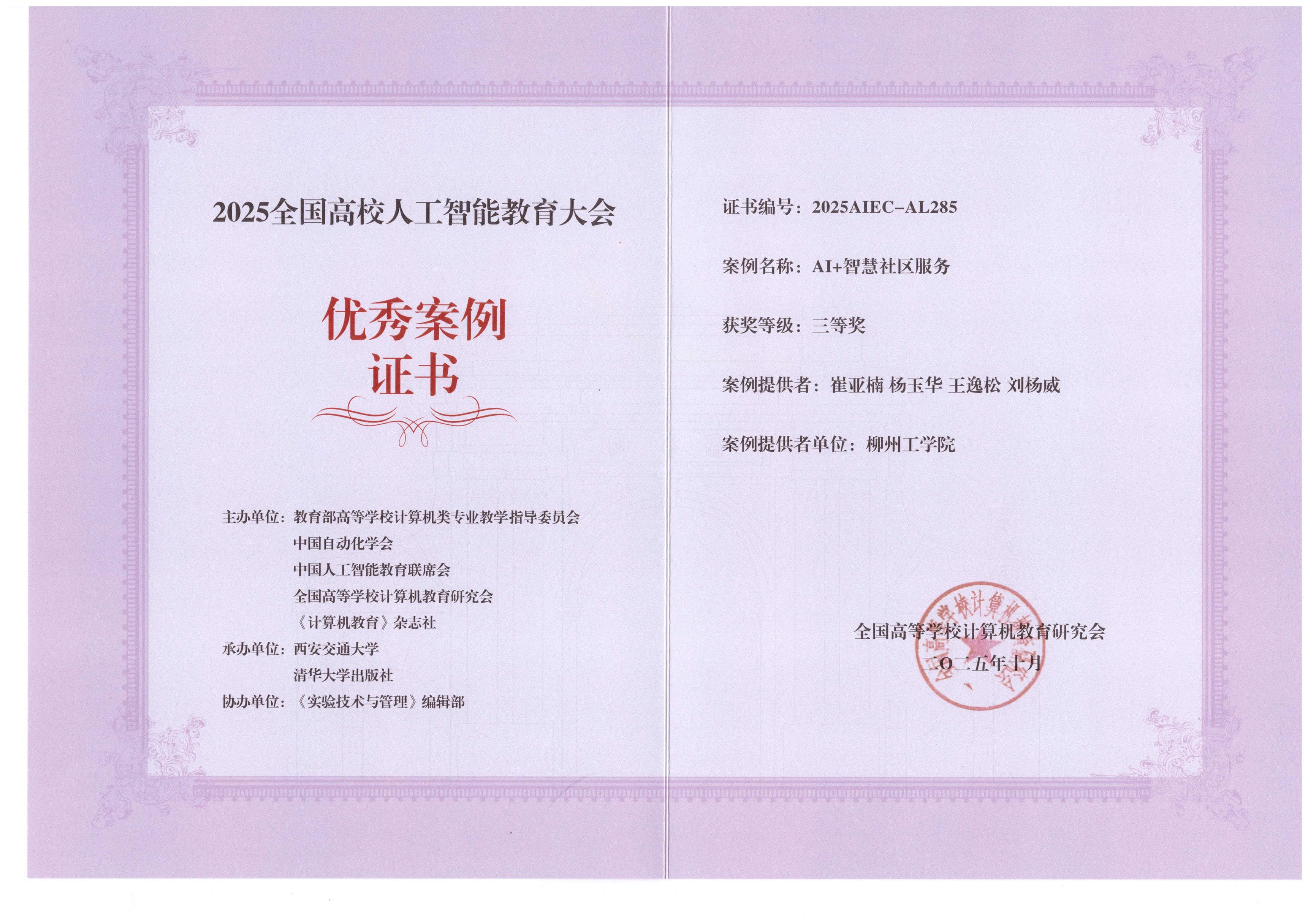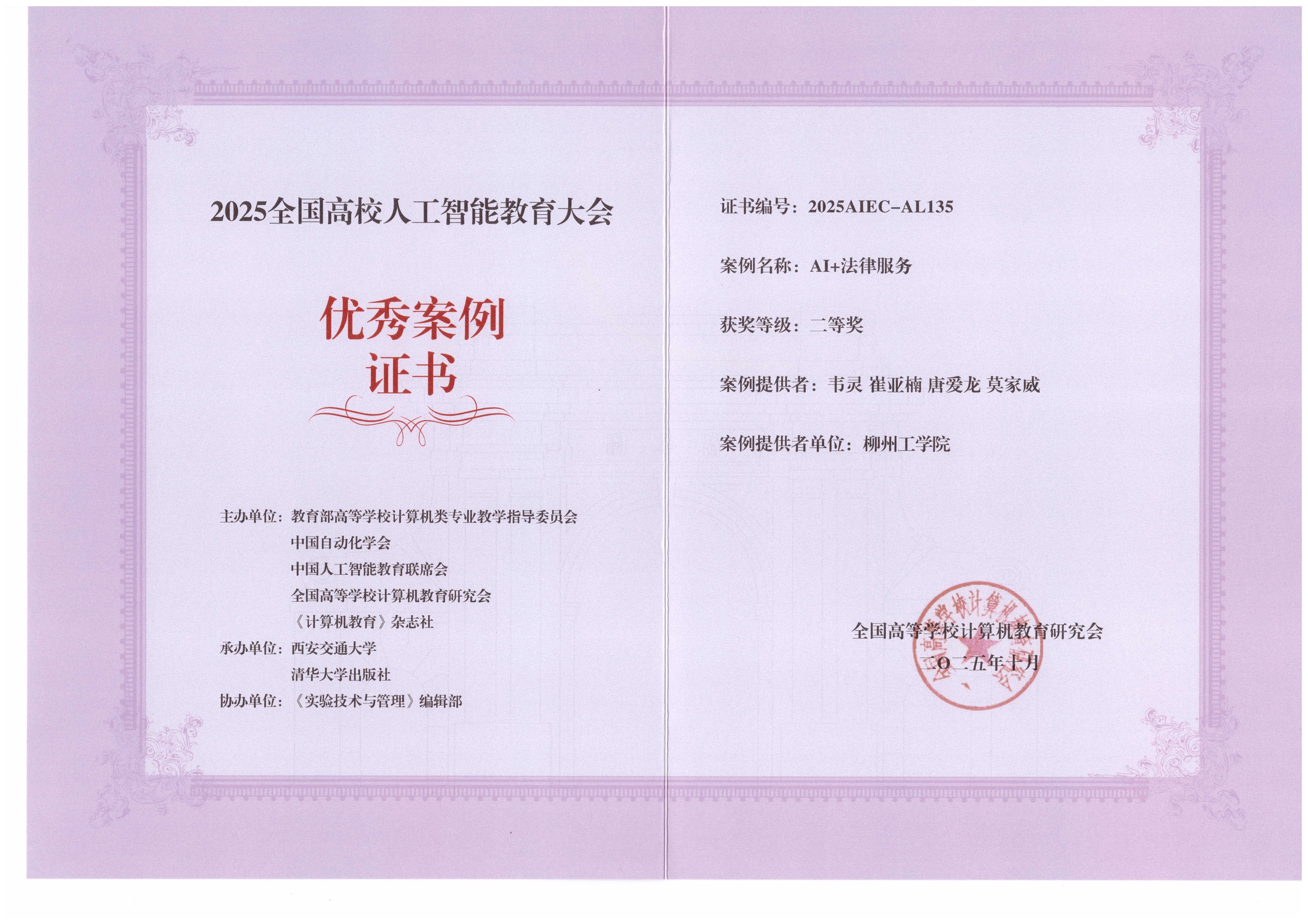 除了学术论文的优异表现,柳州工学院团队在课程教学案例方面也取得了显著成果。其中,韦灵老师团队“AI+法律服务”教学案例荣获二等奖,该案例将人工智能技术与法律实务相结合,通过模拟真实的法律场景,帮助学生更好地理解人工智能在法律领域的应用价值。崔亚楠老师团队“AI+智慧社区服务”教学案例则荣获三等奖,该案例关注智慧社区建设中的实际问题,利用人工智能技术提升社区服务的智能化水平,为社区治理提供了新的解决方案。