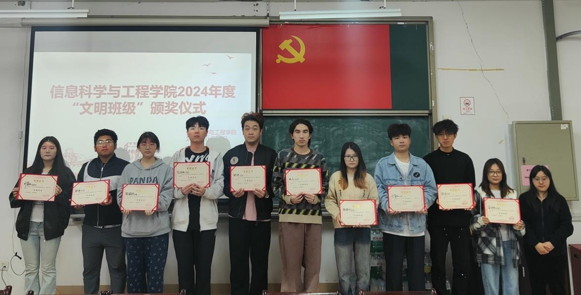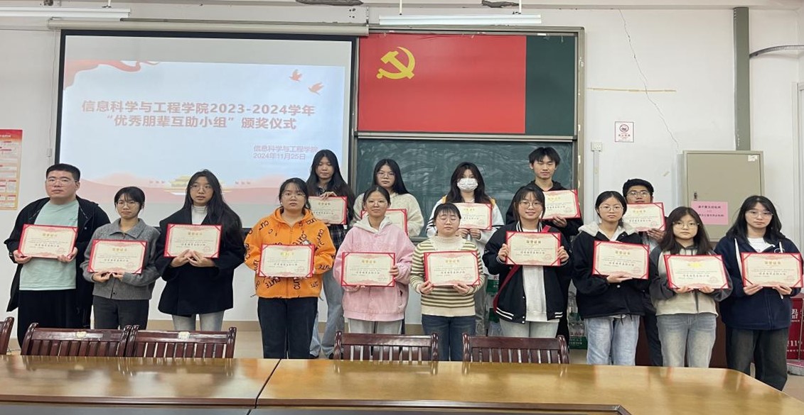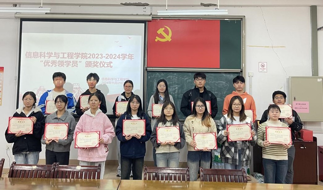 2024年11月25日上午,信科学院在党员活动室进行颁奖。信息科学与工程学院学生第一党支部书记丁亦楠、学生第四党支部书记唐洁为本次获奖的班级和同学颁发证书和奖品。
