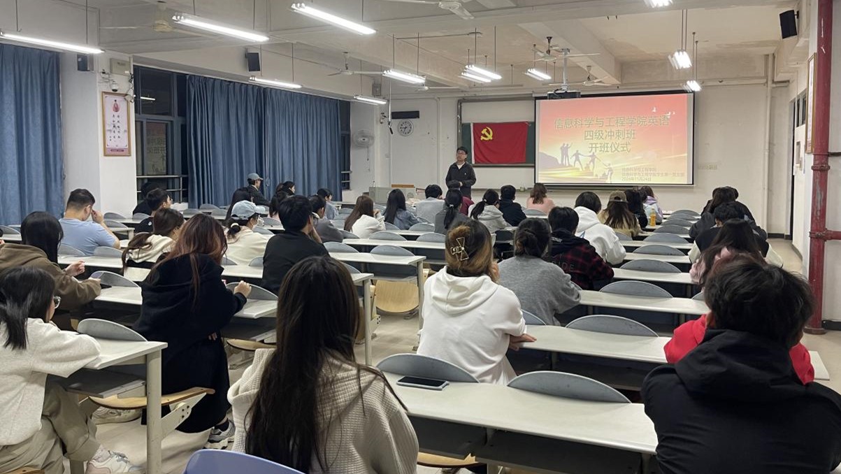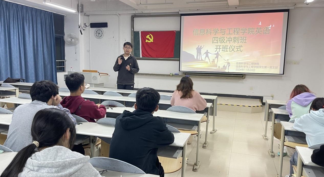 为充分发挥党建引领作用,积极落实“德智体美劳,党建全引领”工作。信息科学与工程学院于2024年11月24日晚,在南校区第一教学楼307举办了英语四级冲刺班开班仪式。英语四级冲刺班由学院学生第一党支部牵头组织,开班仪式有学院党总支书记张琨,学生第一党支部书记丁亦楠及英语四级冲刺班全体学生参加。