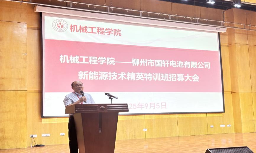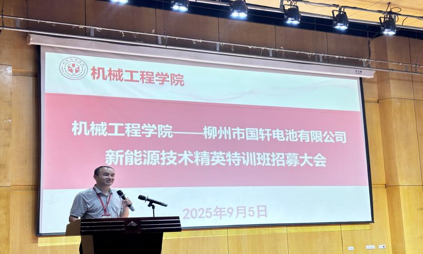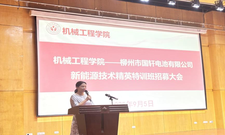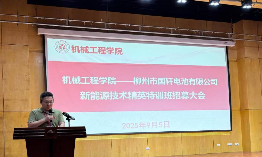为深化产教融合、培养高素质新能源技术人才,2025年9月5日下午14:30,柳州工学院机械工程学院与柳州国轩电池有限公司在学术报告厅联合举办“新能源技术精英特训班”招募会。柳州国轩电池有限公司班子成员、品质管理中心总监、工程研究院副院长何永斌(机械工程学院2011届校友),人力资源部副经理付万龙、人力资源部主管韦海芳,柳州工学院教务处处长刘锋涛、机械工程学院党政领导班子、教研室主任及教师代表,与机械工程学院2026届毕业生共聚一堂,共同开启新能源技术人才培养新篇章。