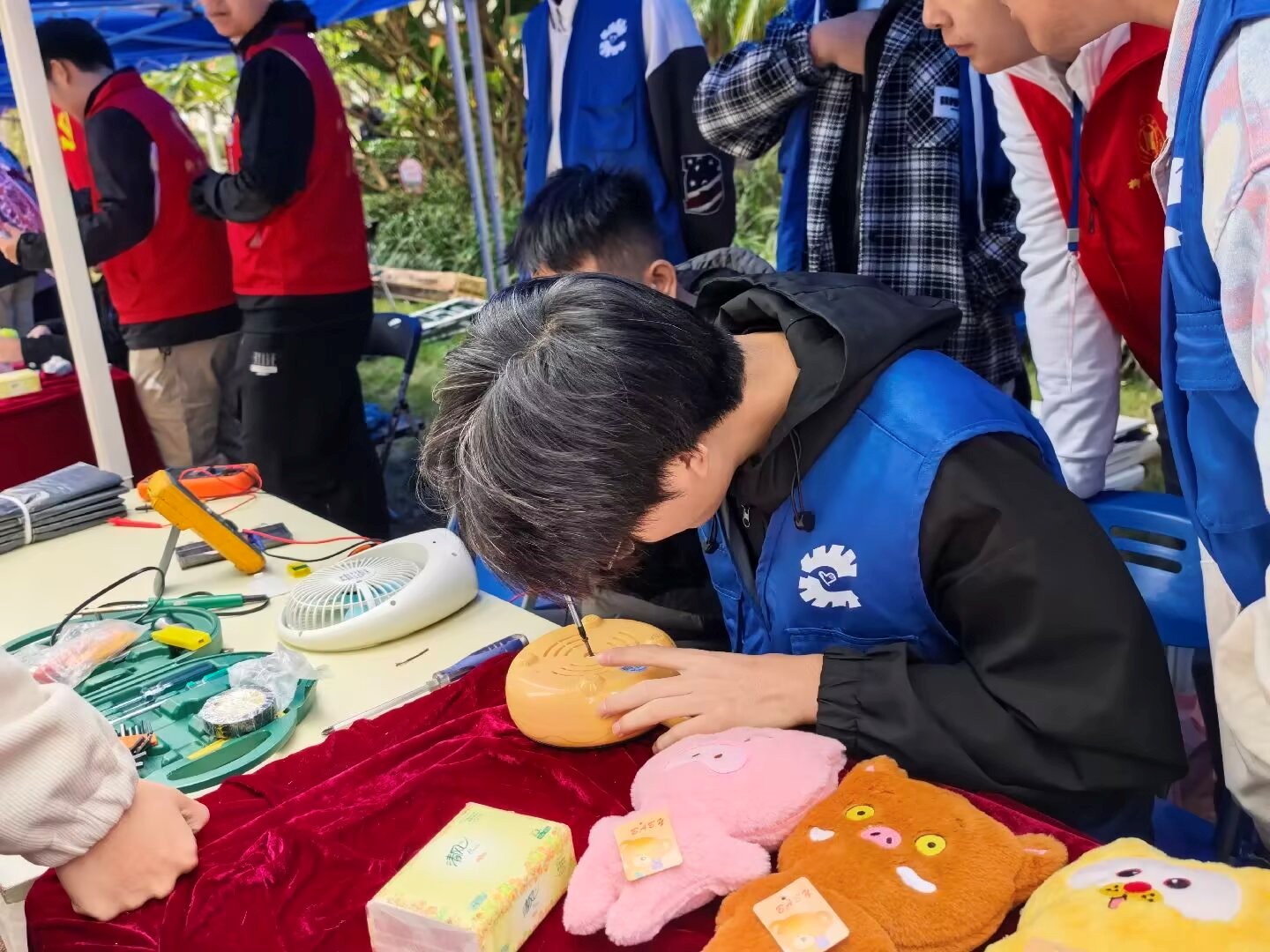 在众多服务项目中,机械工程学院青年志愿者协会的“蓝扳手”志愿服务队和禁毒宣传展台尤为引人注目。“蓝扳手”的同学们运用所学工科知识,为居民们检修小家电、解答技术问题,那灵巧的双手和专注的神情,正是知识服务社会的最佳注解。同时,志愿者们还向来到“蓝扳手”摊位前的居民普及毒品知识。他们通过清晰明了的讲解和生动鲜活的案例,将“珍爱生命,远离毒品”的理念深植于社区居民的心中。