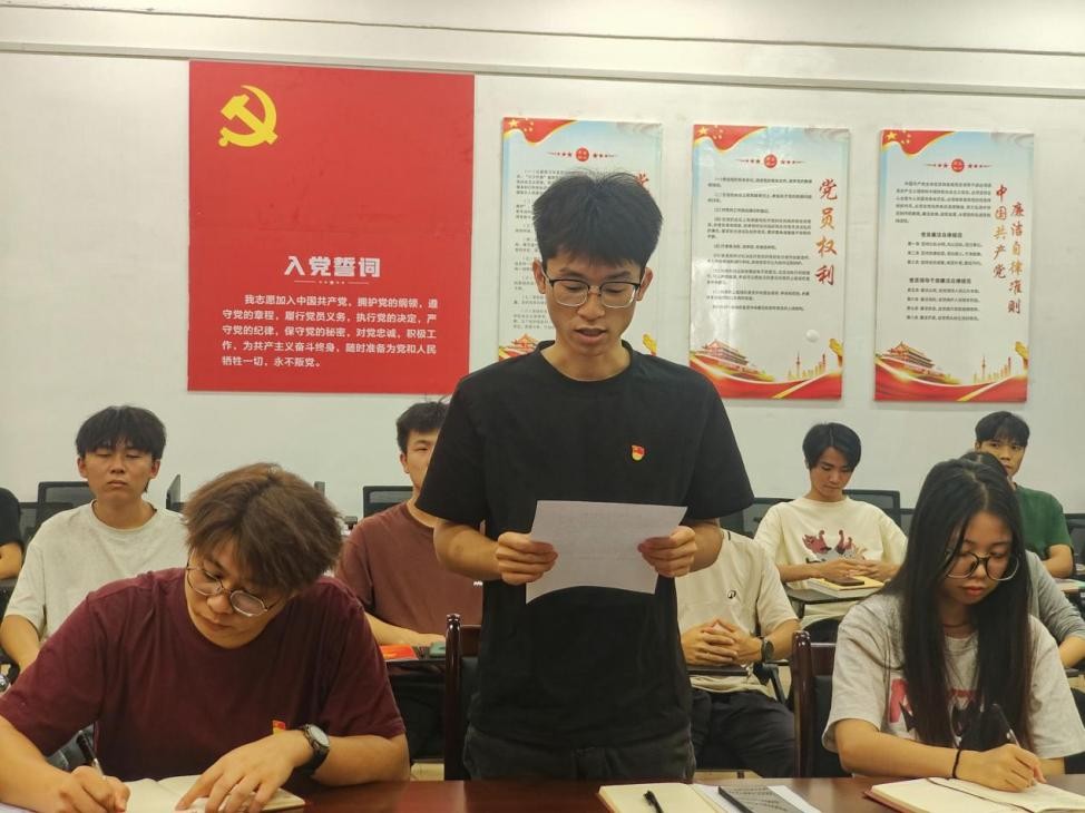 大会第二项:预备党员做思想汇报及新转入支部党员做自我介绍。5位春季学期新发展党员(高玉泽、李彧、赵干豪、吴采诗、朱旭)与2位新转入支部党员(覃转、陆顺),结合自身学习研究方向、思想成长历程及未来规划作自我介绍和思想汇报。他们纷纷表示,将以新学期为新起点,在专业学习中锤炼本领,在服务师生中践行初心,为支部建设注入新活力。