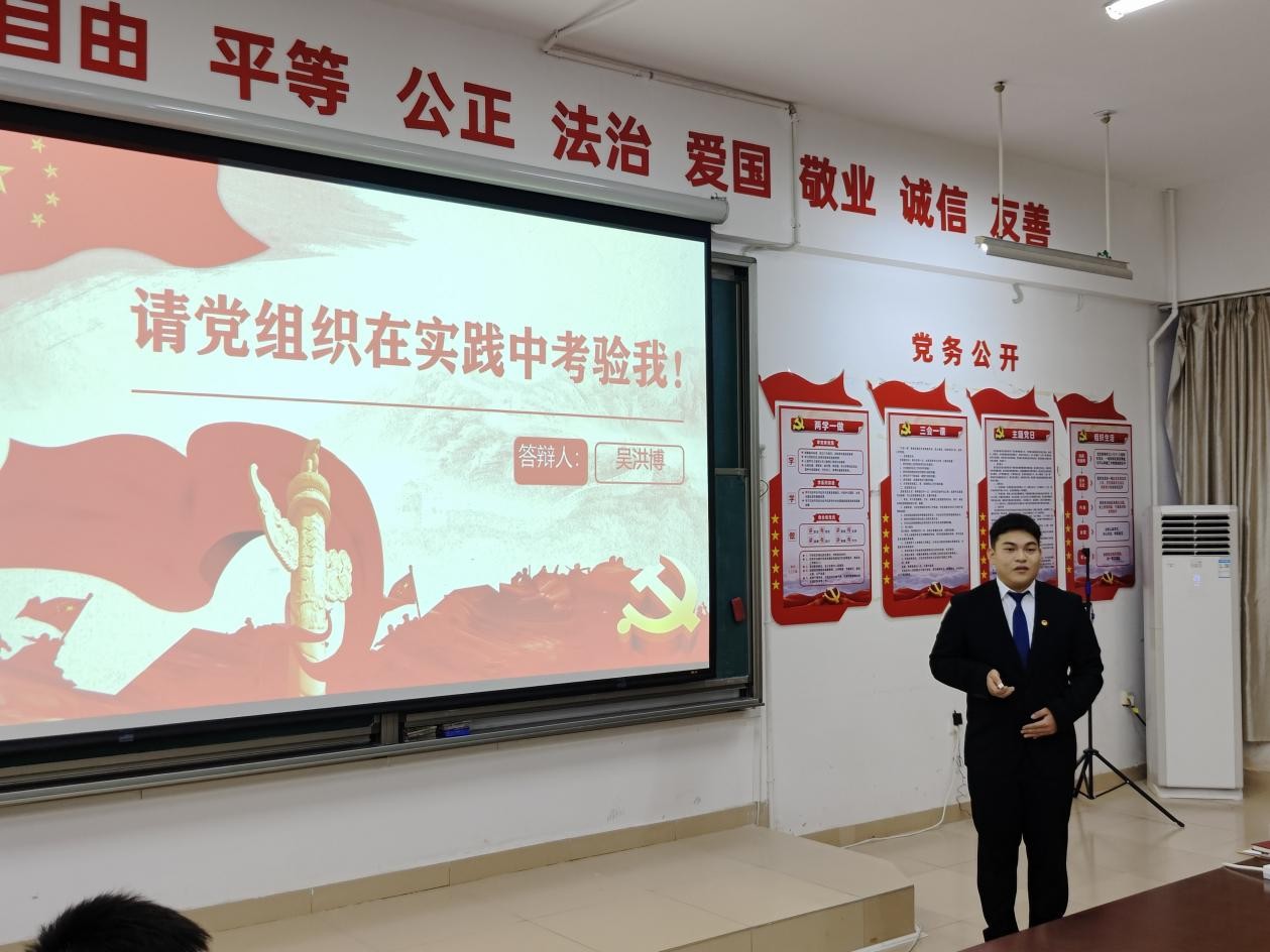 随后,朱旭同志详细介绍了答辩环节的具体安排。该环节分为自我陈述和评委问答两个部分。在自我陈述环节,积极分子需在五分钟内全面总结自己在积极分子期间在思想、学习、工作及生活等方面的表现,并阐述个人对党的认识、入党动机、志愿服务经历及获奖情况。参与答辩的积极分子们以真挚的语言和饱满的情感,充分展现了对党的坚定信仰以及积极向党组织靠拢的坚定决心。