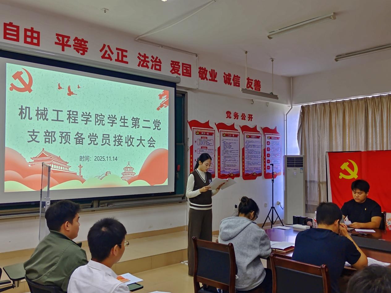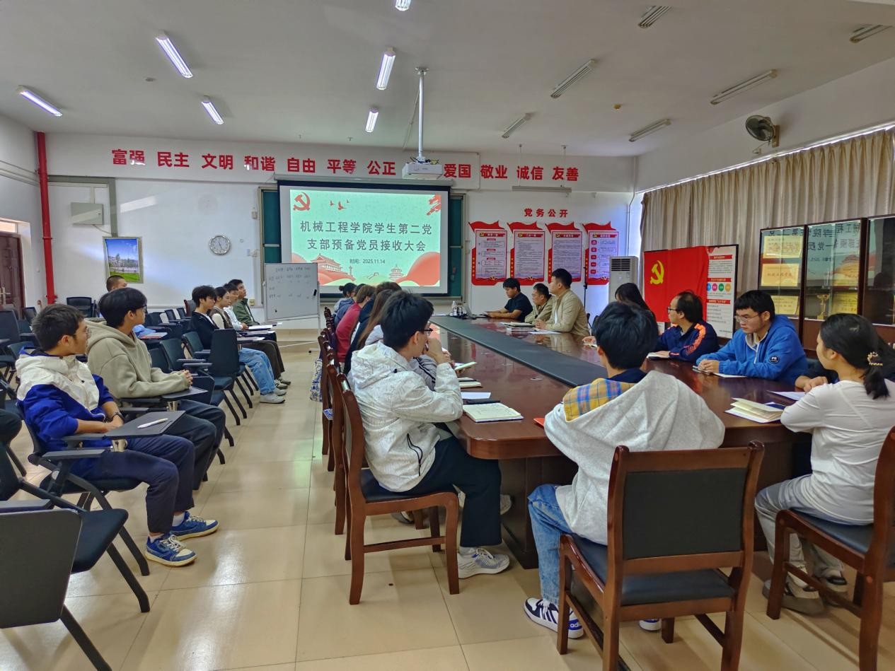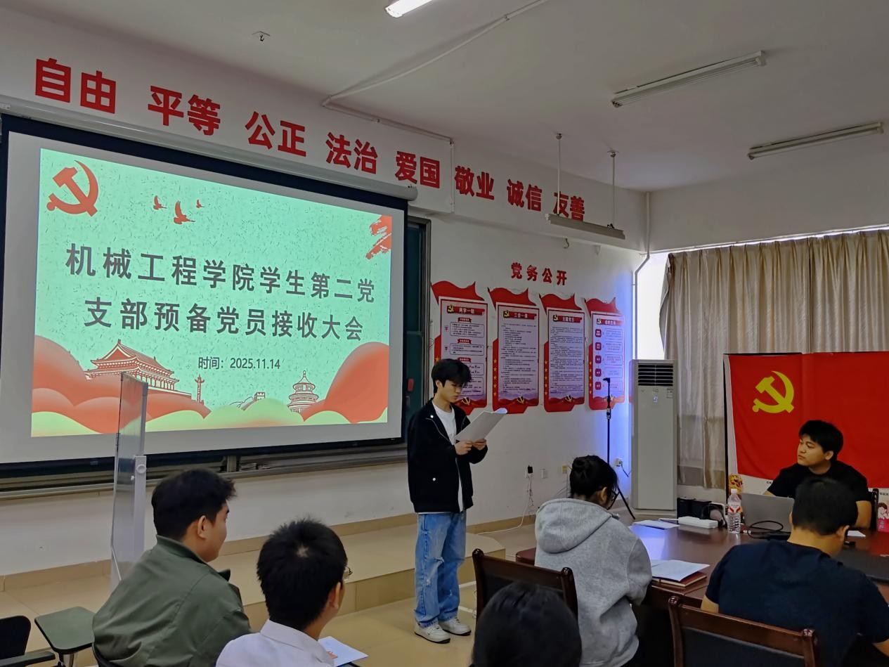 为进一步增强党的组织力量,提升党的影响力和凝聚力,夯实党的基层组织建设,2025年11月14日,机械工程学院学生第二党支部在第一实训楼316党员活动室召开接收预备党员大会。会议专题讨论了关于接收吴洪博、刘德健、岳晓丹、吴荣发等4名同志为预备党员的相关事宜。参会人员包括机械工程学院全体党员和积极分子。本次会议由朱旭同志主持。