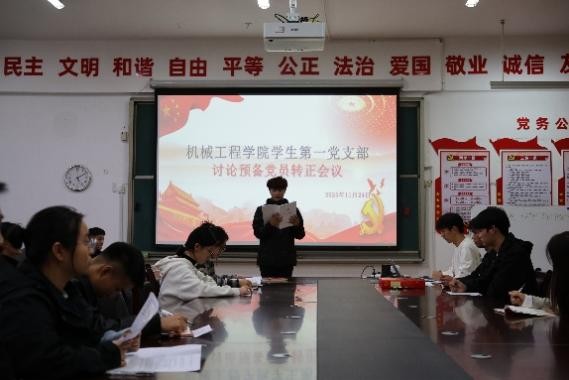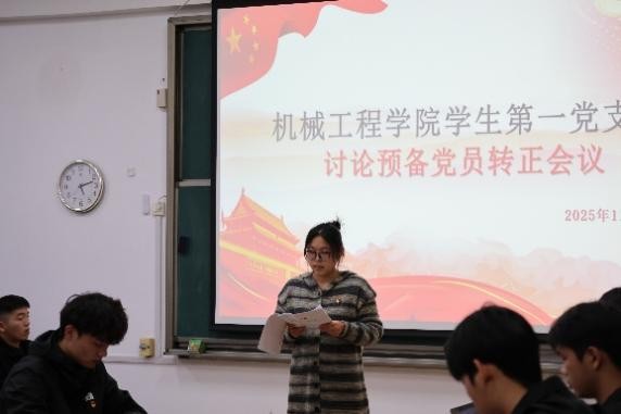 2025年11月24日,机械工程学院学生第一党支部在党员活动室召开预备党员转正会议,讨论万如乐等3名同志预备党员的转正问题。参会人员有机械工程学院学生第一党支部书记张金凤以及全体学生党员。本次会议由彭健同志主持。
