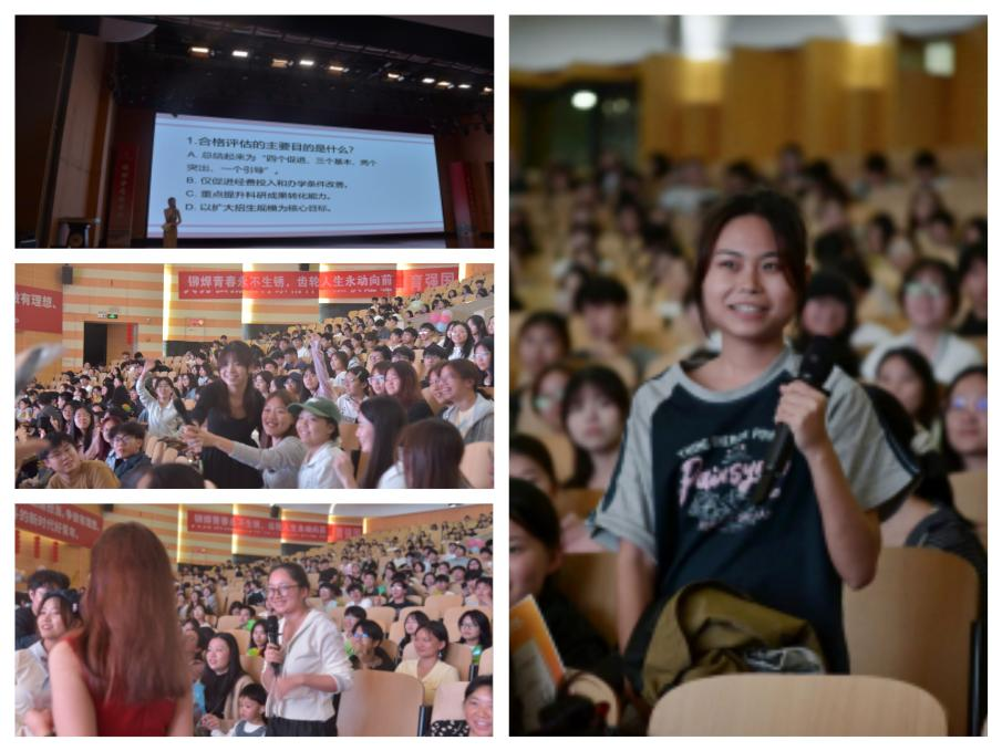 晚7时,大学生活动中心灯光璀璨,文艺汇演以“青春”为主线,分三个篇章精彩呈现。音乐爱好者协会、大学生艺术团声乐队、吉他爱好者协会等社团轮番登台,《爱你》《星辰大海》《小幸运》等歌曲唱响青春旋律;舞蹈爱好者协会的动感舞步、云寂古风社的诗意演绎,与《山海》《光年之外》等金曲合唱碰撞出绚烂火花。演出间隙还穿插“本科教学工作合格评估基本知识”互动问答,师生积极参与,在轻松氛围中传递知识。