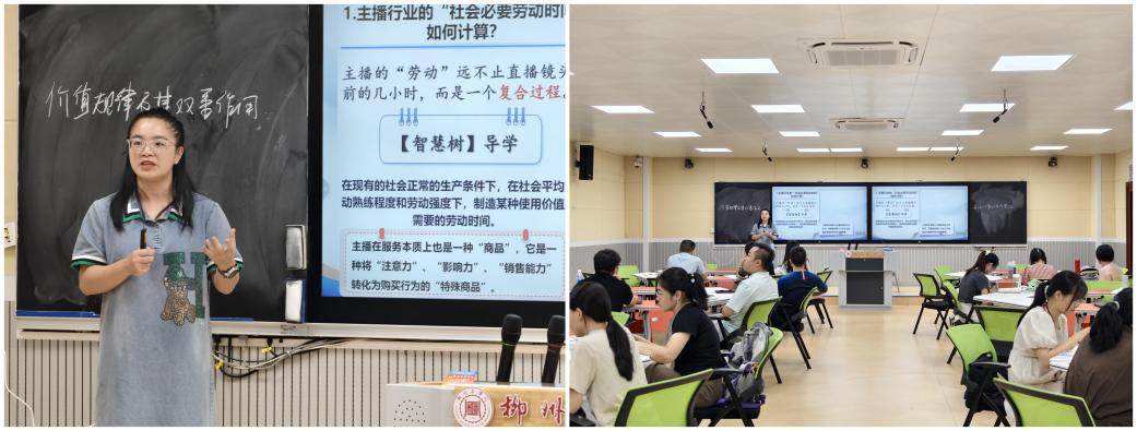 上午的教学展示环节中,马克思主义基本原理课教师韦丽丽以《直播经济中的劳动价值论》为题,紧扣价值规律、劳动价值论当代演化、数字资本规制等核心命题,通过问题链设计引导学生思考。课程结合直播打赏、AI虚拟主播等鲜活案例,运用案例教学、智慧树平台互动等多元方式提升课堂效能,并设置讨论分享环节强化理论应用。梁炳辉教授肯定课程在理论深度与现实案例结合上的创新,特别赞赏抽象理论与新业态的融合表达,同时建议进一步强化工科专业适配性与地方产业融合度,推动思政课实现“内容——方法——评价”系统性升级。