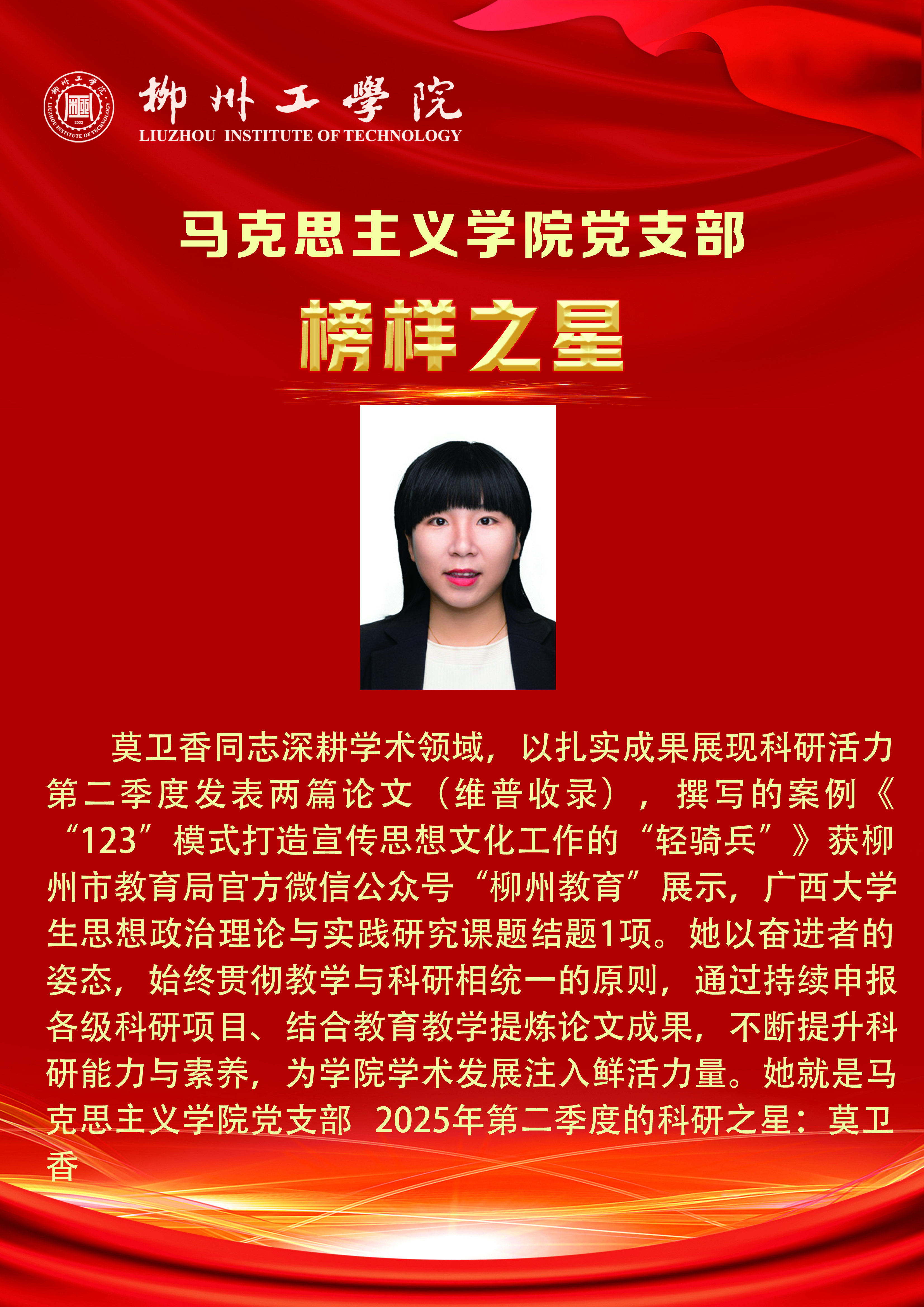 【党建动态】马克思主义学院党支部2025年第二季度榜样之星(科研之星):莫卫香