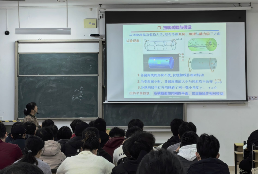 课堂上,黄老师从回顾扭转基本概念入手,循序渐进,巧妙运用多媒体等教学手段,凭借制作精良的课件、生动深入的讲解,将抽象的力学原理与公式推导阐释得清晰透彻。黄老师教态从容,展现出了深厚的理论功底、丰富的教学经验与娴熟的课堂驾驭能力,为观摩师生呈现了一堂高水平的示范课。