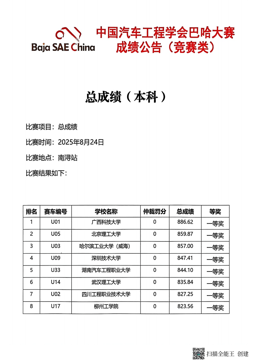 2025年8月24日,第十一届中国汽车工程学会巴哈大赛圆满落幕。该赛事汇聚了吉林大学、哈尔滨工业大学(威海)、北京理工大学、湖南大学、武汉理工大学等多所学府的车队,吸引了全国115支精英车队参赛同台竞技。经过激烈角逐,柳州工学院LS Racing车队在商业营销、设计报告、直线爬坡等多个本科组项目中表现出色,斩获商业营销本科组第十名、设计报告本科组第八名、直线爬坡本科组第五名、操作性本科组第四名、单圈计时本科组第四名、耐久性本科组第九名等多项佳绩,最终荣获了本科组全国一等奖和卓越宣传团队称号。