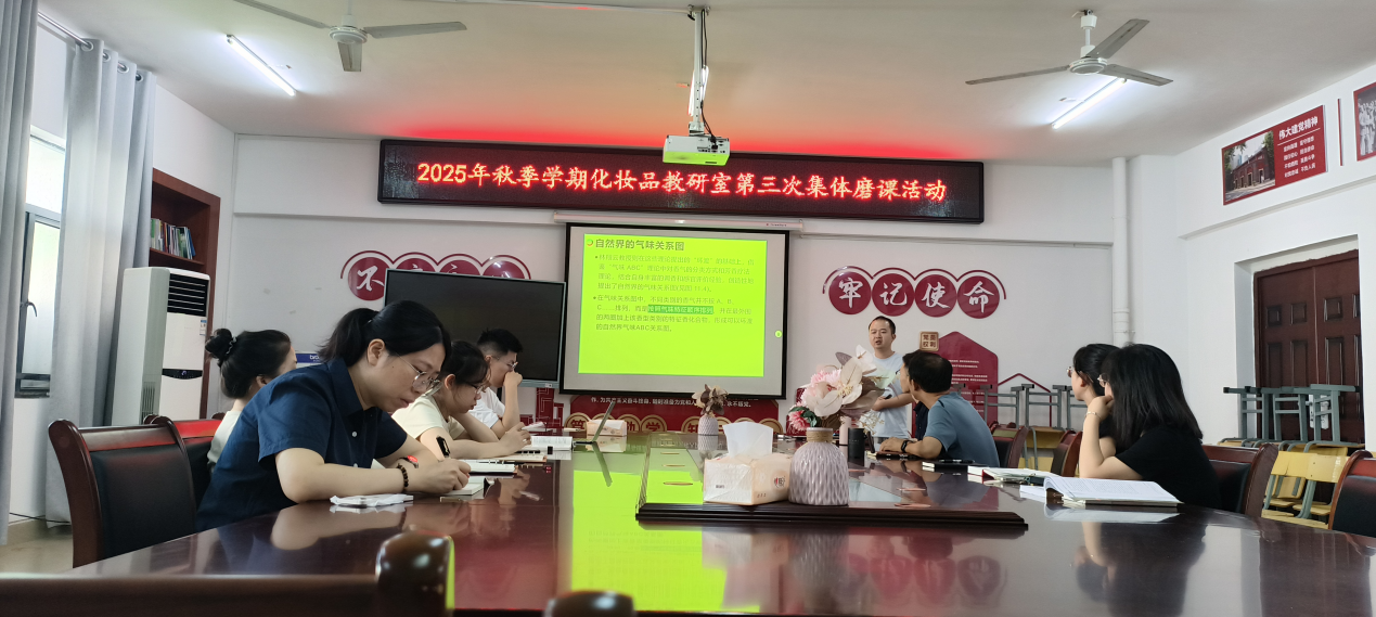 为进一步提升教学质量,促进教师专业发展,9月16日上午,化妆品教研室开展了本学期第三次集体磨课活动。本次活动由教研室主任杨育兵主持,化妆品教研室专任教师参与,围绕“教学内容优化、教学方法创新、课堂互动提升”三大主题展开深入研讨。