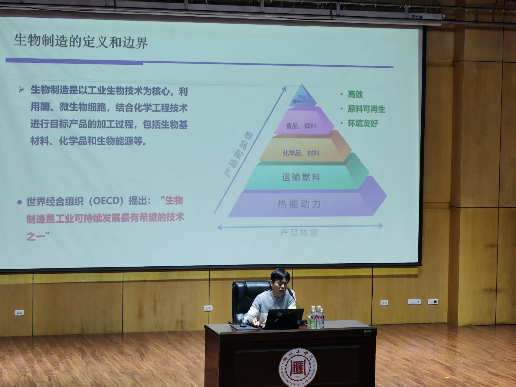 培训中,曹利民教授以 “微生物代谢工程设计与生物信息学组学应用” 为核心主线,循序渐进展开分享。他从基础理论出发,系统阐释了生物制造的核心定义,深入解析代谢工程与合成生物学的核心原理,让在场师生对学科基础框架形成清晰认知。为帮助师生更好地理解理论知识,曹教授结合 β- 胡萝卜素生物合成、1,4 - 丁二醇生物合成等多个典型工业应用案例,层层剖析微生物细胞工厂的构建逻辑、关键流程及优化策略,将抽象的理论转化为具体可感的实践路径。同时,曹利民教授聚焦宏基因组、转录组等核心组学技术,通过直观的图文展示,详细拆解测序分析的完整流程与数据解读的关键方法。同时,他分享了团队在极端条件下酿酒酵母进化研究中的最新进展,毫无保留地传递了实操过程中的实用技术与宝贵经验,为师生开展相关科研工作提供了重要参考。