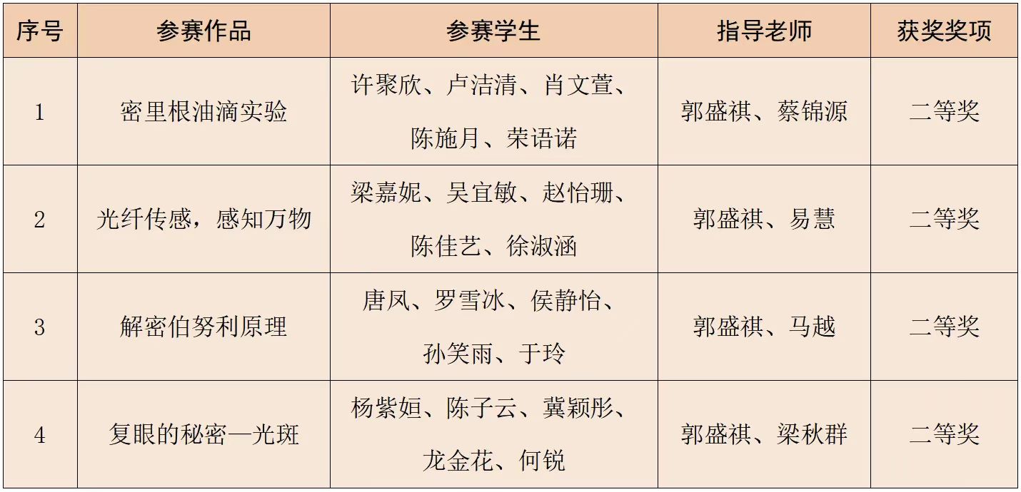 近日,由高等学校国家级实验教学示范中心联席会物理学科组、教育部高等学校大学物理课程教学指导委员会、教育部高等学校物理类专业教学指导委员会、中国物理学会物理教学委员会共同主办的第十一届全国大学生物理实验(创新)竞赛在湖南长沙圆满落幕。食化学院学子在作品展示、现场演讲及答辩等各环节中表现优异,共获4项国家二等奖,较去年翻一番,成绩位列全区前茅,展示了我院学生扎实的物理化学知识和优异的创新能力。