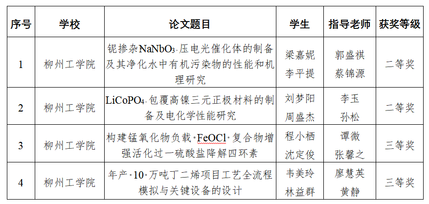 近日,第二十六届广西高校大学生化学化工类学术创新成果大赛评审结果公布,该赛事旨在展示广西化学化工类专业本科毕业论文(设计)的优秀成果。食品与化学工程学院参赛团队表现优异,参赛作品获得二等奖2项、三等奖2项,其中学术论文成果3项,工程设计成果1项,综合成绩位列同类院校前茅。