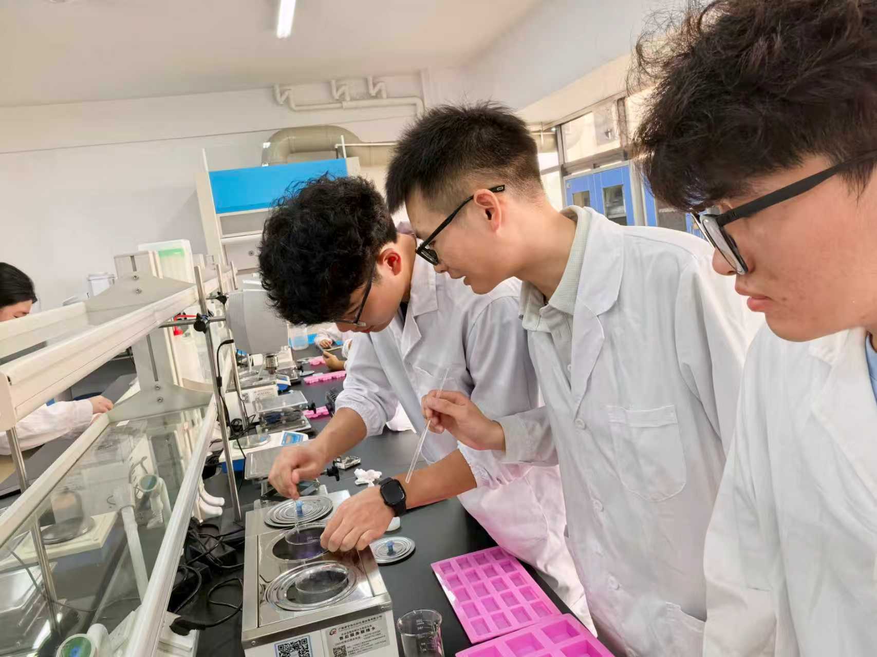 活动前夕,各社团在指导老师的带领下精心筹备。食品感官分析协会在杨小双老师的指导下,反复调试奶茶配方,精准把控茶叶选品与糖分比例,力求风味协调。化妆品创新协会在郑立浪老师的带领下,引导参与者调配个性化香水,通过香精浓度梯度实验,让抽象的化学知识变得可感知、可体验。绿色化工协会在唐小松老师的指导下,严格按比例混合植物油与精油,加入碱液搅拌至浓稠,再经冷却定型,制成色彩缤纷、香气四溢的手工皂。食品营养健康协会则在梁舒韵老师的带领下,熬煮红茶与牛奶,科学配比糖浆与珍珠,最终呈现出香气浓郁、温暖甘甜的招牌奶茶。