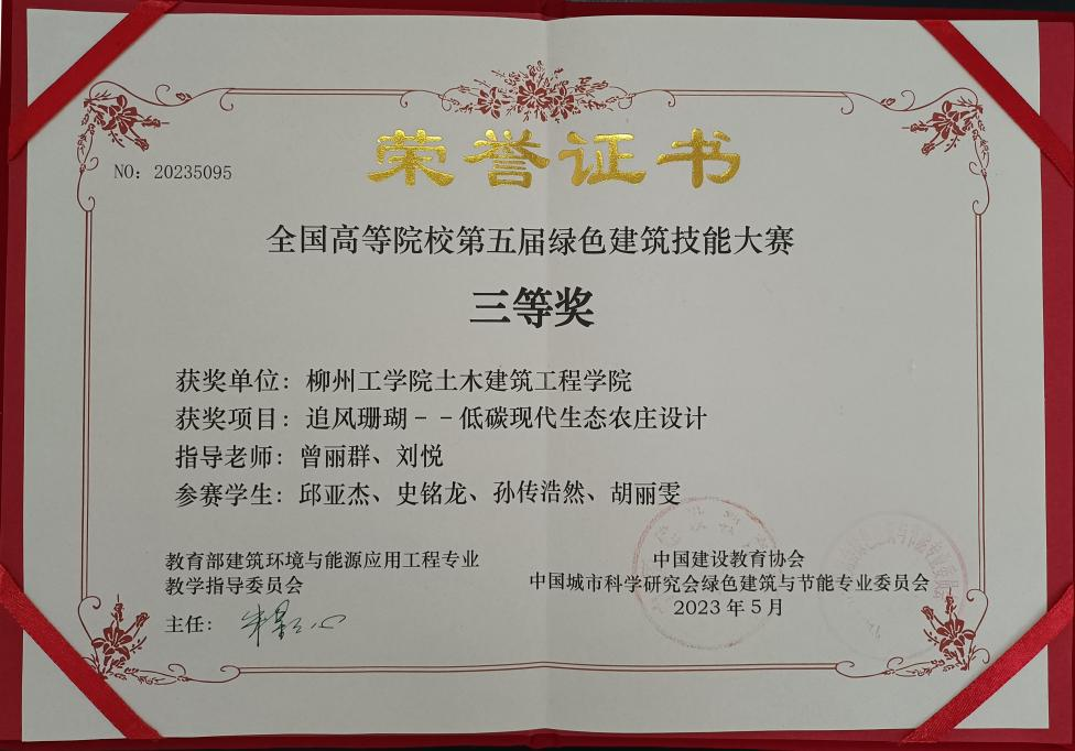 第五届全国高等院校绿色建筑技能大赛获奖证书
