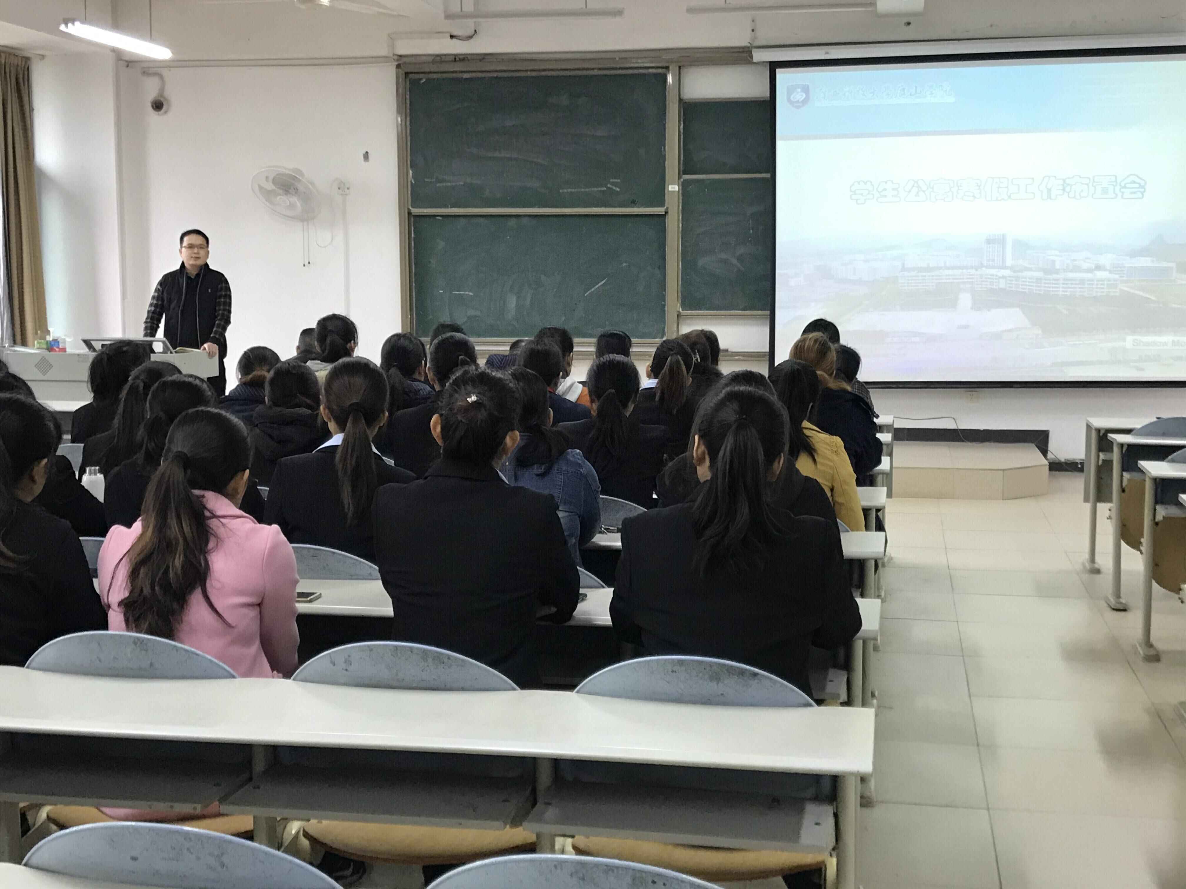 2020年1月9日,学生工作部在一教306教室分别召开了学生公寓寒假工作布置会和寒假留校学生会议。学生工作部副部长黄增辽、人武部副部长李明、公寓管理中心职员和全体宿舍安全员以及全体留校学生,会议由公寓管理中心方宏川老师主持。