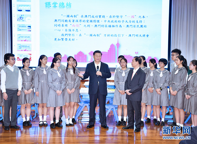 12月19日,国家主席习近平在澳门特别行政区行政长官崔世安陪同下,来到位于澳门黑沙环的政府综合服务中心和濠江中学附属英才学校,同澳门市民和师生亲切交流。在濠江中学附属英才学校观摩以“‘一国两制’与澳门”为题的中国历史公开课后,习近平走到学生中间即席发表重要讲话。(新华社记者 李涛/摄)