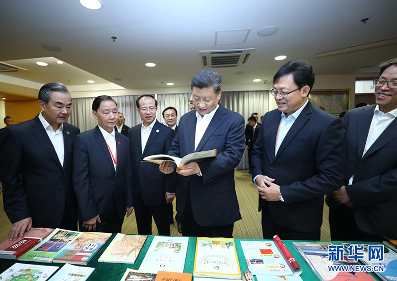 习近平来到学校图书馆,听取澳门教育总体情况和学校校史介绍,了解澳门回归以来特别行政区和学校爱国主义教育工作情况。展台上摆放着《中国历史》《品德与公民》等教材,习近平拿起教材仔细翻看。习近平表示,教材是爱国主义教育的重要载体,特别行政区政府同内地合编教材的做法值得充分肯定。要鼓励更多学校使用新教材,让老师们把教材讲好、讲活、深入人心。