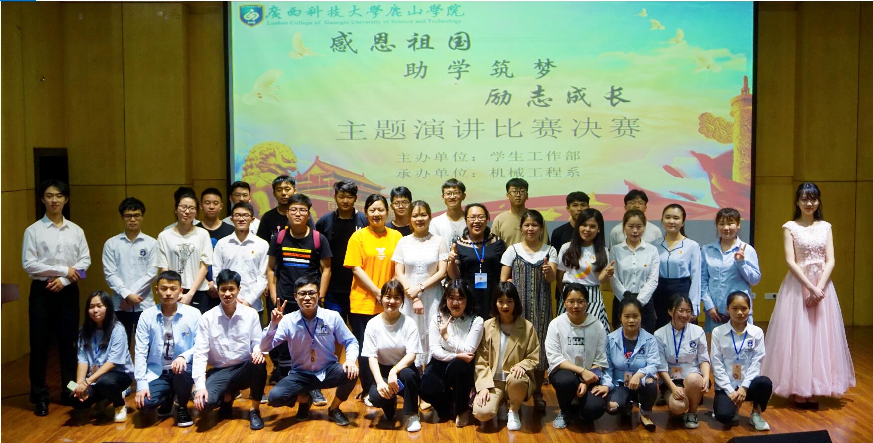 为进一步推进我院家庭经济困难学生资助政策的宣传工作,展现家庭经济困难学生在资助政策支持下成长成才的精神面貌,引导广大学生努力学习、感恩祖国、回馈社会。2019年5月14日晚上7:00,由广西科技大学鹿山学院学生工作部主办、机械工程系承办的“感恩祖国、助学助梦、励志成长”主题演讲比赛决赛于学术报告厅举行。廖雪妃老师、陈露老师、卢杰老师以及4名来自各系的学生代表担任本次活动评委。我院各系资助专员及400余名学生参加本次活动。