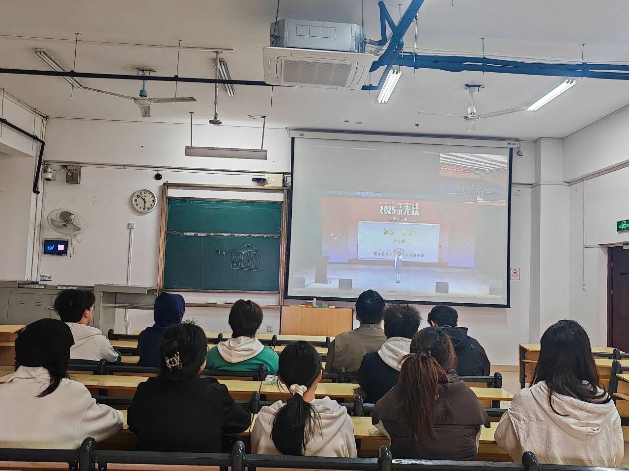 直播过程中,当庄严的国歌声从屏幕中传出,全体学子自觉起立、肃立致敬,目光坚定而专注;在教育部负责同志的领读下,大家齐声诵读宪法核心条款,“中华人民共和国的一切权力属于人民”“国家尊重和保障人权”等铿锵有力的字句跨越网络空间,在校园各处回荡,让青年学子在沉浸式参与中感受宪法作为国家根本大法的威严与温度。合唱环节,学子们跟随旋律共同唱响《宪法伴我们成长》,用青春之声传递对宪法的尊崇与信仰;在优秀作品展演环节,全国总决赛获奖选手的精彩表现,更让大家深刻体会到宪法与青年成长、社会发展的紧密联系。